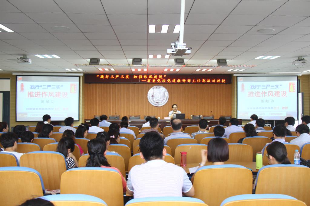为深入开展“三严三实”专题教育,切实增强党员干部践行“三严三实”的思想自觉、行为自觉,推动学院各项工作快速可持续发展, 7月2日下午,学院特邀河南省委党校党建部主任郭献功教授为学院全体党员干部做“践行‘三严三实’ 推进作风建设”专题讲座。院领导花明、郭茂华、胡景团、钟会亮、张官印、王家桥,各部门负责人、全体党员聆听了报告。报告会由党委副书记胡景团主持。