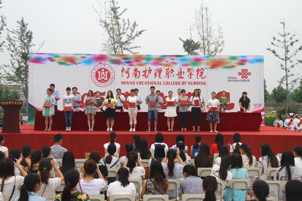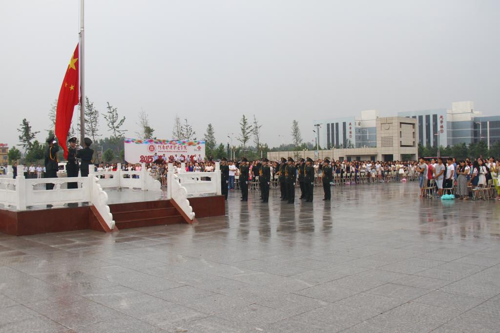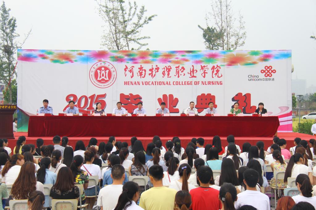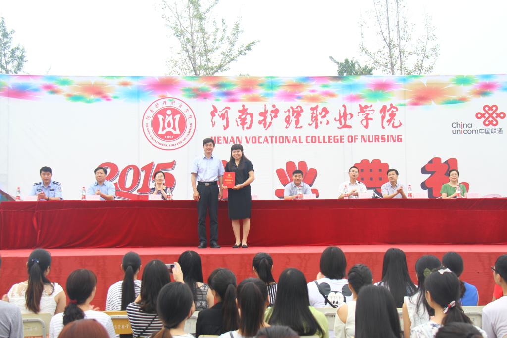 毕业典礼在庄严而隆重的升国旗仪式中拉开序幕,学院党委书记花明向学院特邀嘉宾、2000届毕业生索莉娜同志颁发“优秀校友”荣誉证书,党委副书记、纪委书记胡景团宣读了《河南省教育厅关于表彰2015年河南省优秀应届大中专毕业生的决定》,副院长张淑爱宣布了学院2015届大专毕业生名单,学院领导分别向2015届毕业生代表、河南省优秀毕业生颁发证书。