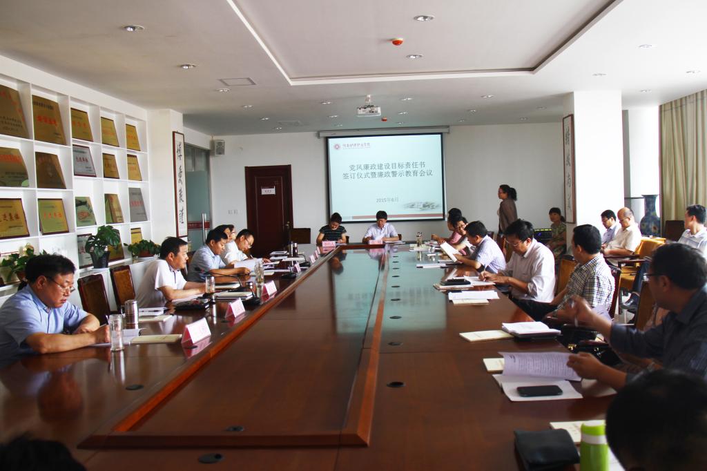 2015年6月3日上午,学院在大会议室举行党风廉政建设目标责任书签订仪式暨警示教育专题会议,院领导花明、郭茂华、胡景团、钟会亮、张淑爱、张官印、王家桥、申培红出席会议,学院全体中层干部参加会议。会议由院党委副书记、纪委书记胡景团主持。