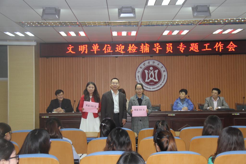 钟院长对在宿舍安全工作中表现优秀的辅导员彭思媛、崔丽丽老师以及学生提出表彰,并颁发奖金。