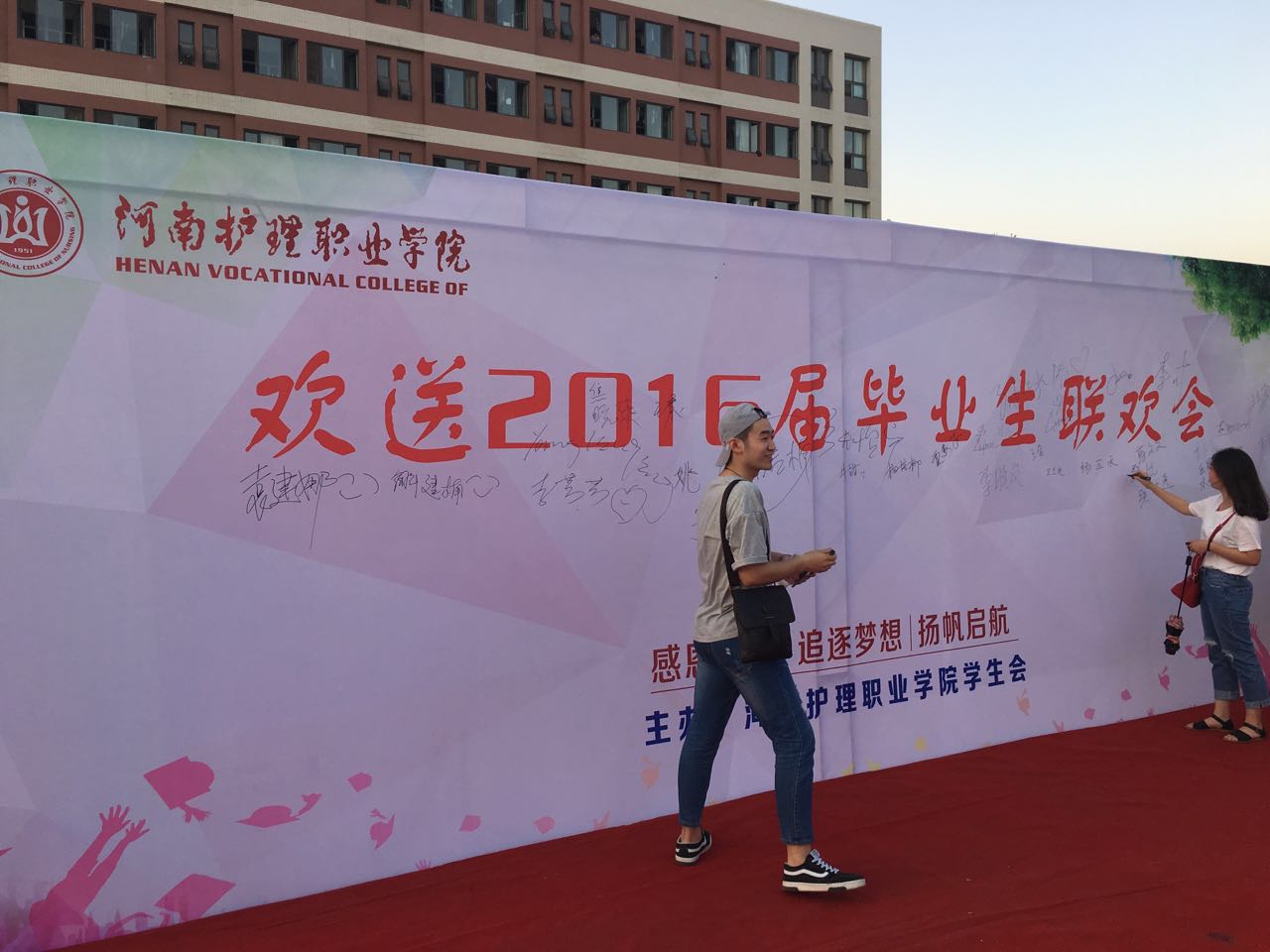 6月14日,在2016届毕业生即将离校之际,院团委、学生会在学院南丁尔格广场开展毕业生签名留念活动。