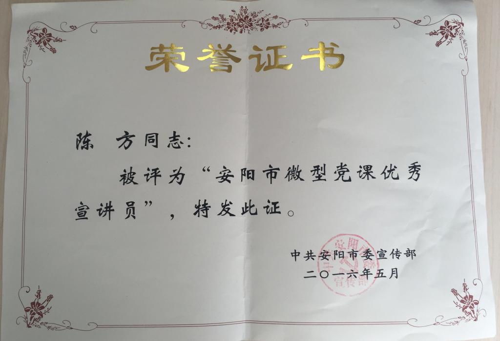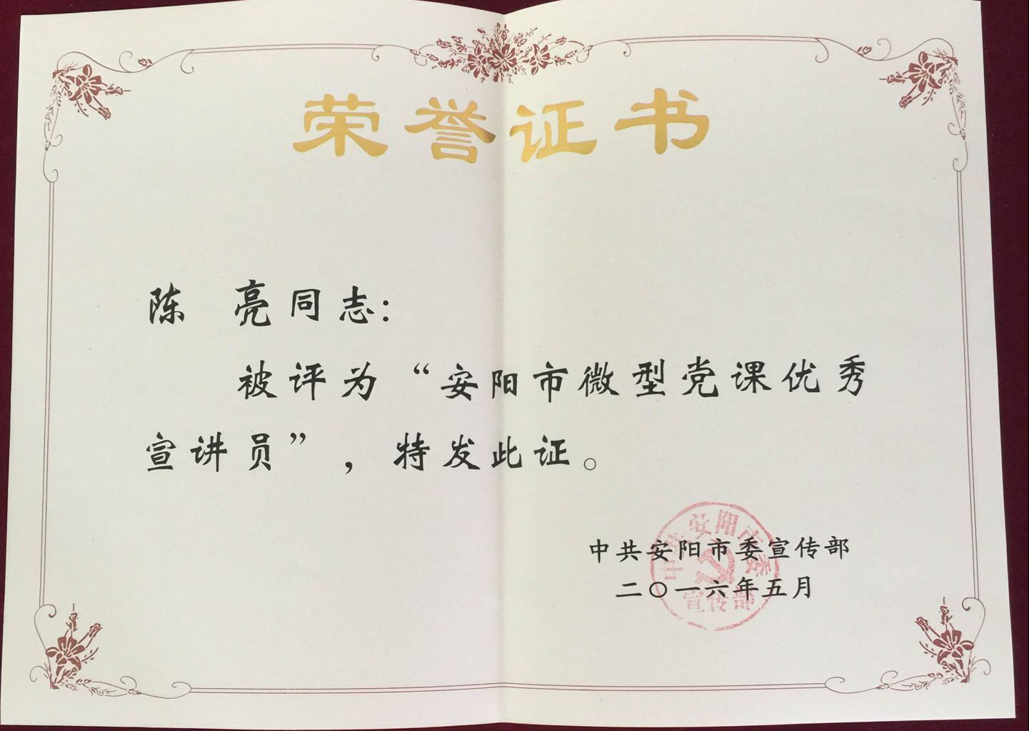 根据中共安阳市委宣传部《关于推荐选拔微型党课宣讲员的通知》要求,学院党委高度重视,迅速在全院展开遴选工作。最终,思政部选送的陈方、陈亮老师经过安阳市专家评选等程序,入选第一批“安阳市微型党课优秀宣讲员”。