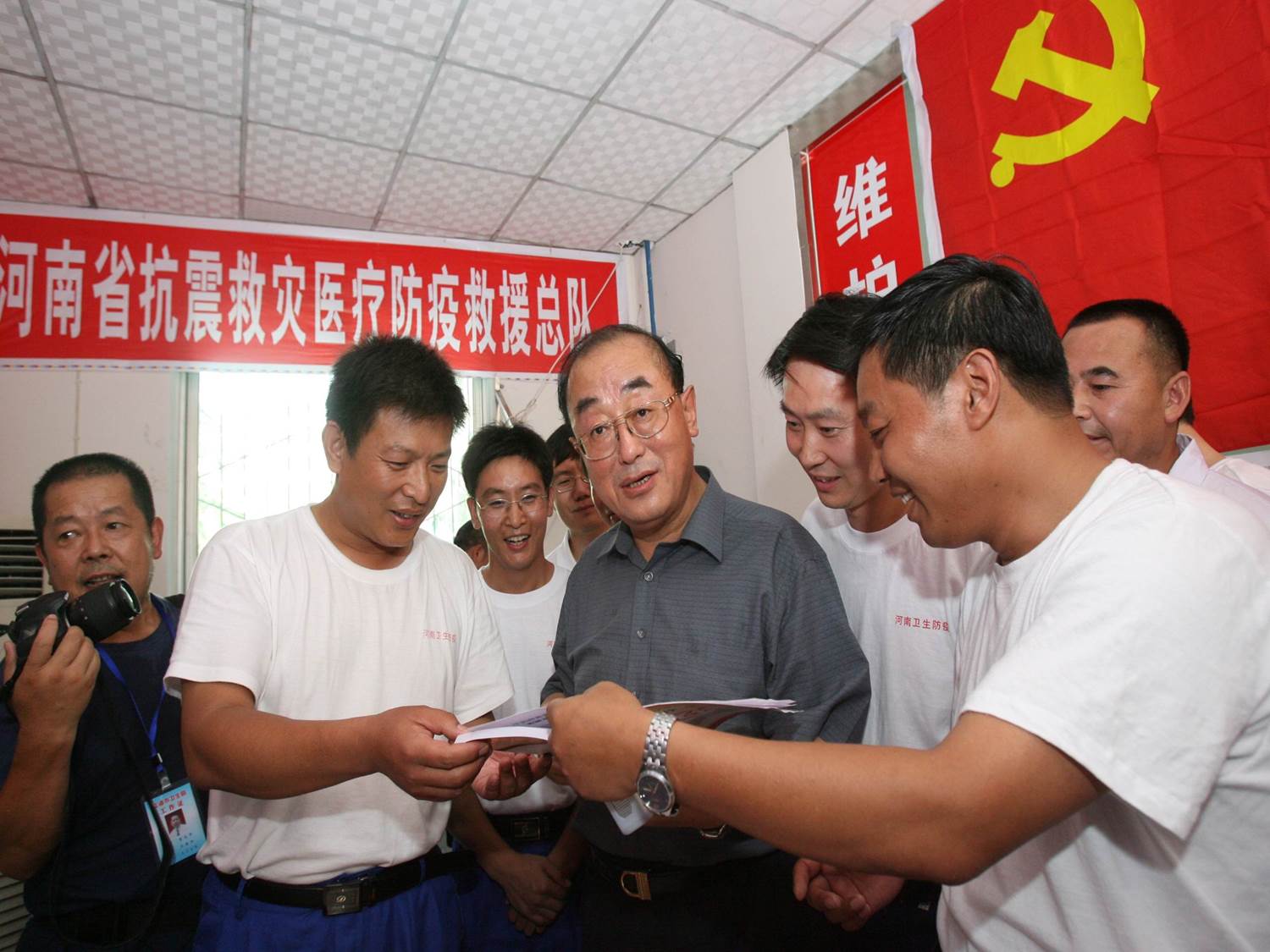 | 国务院抗震救灾总指挥部卫生防疫组组长、卫生部党组书记、副部长高强看望河南医疗防疫队员 |
