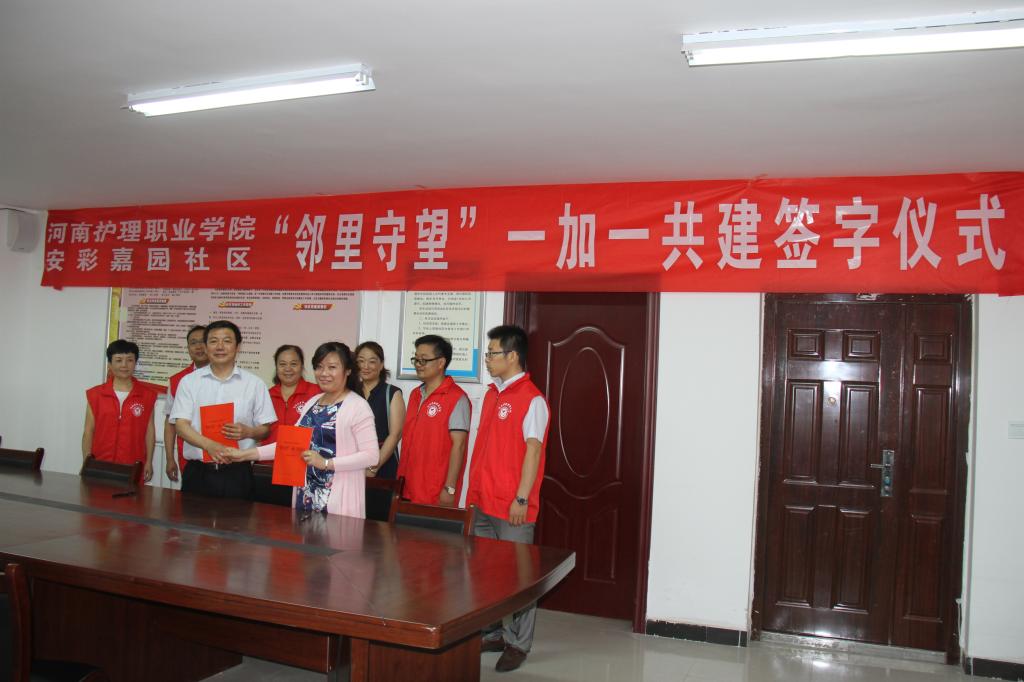 6月28日,学院党委副书记胡景团代表学院和安彩嘉园社区签订了“邻里守望”帮扶协议。同时,党员志愿服务队在安彩嘉园开展党员进社区志愿服务活动,拉开了学院“做志愿表率,为党旗增辉----党员志愿者进社区集中服务月”活动的大幕。