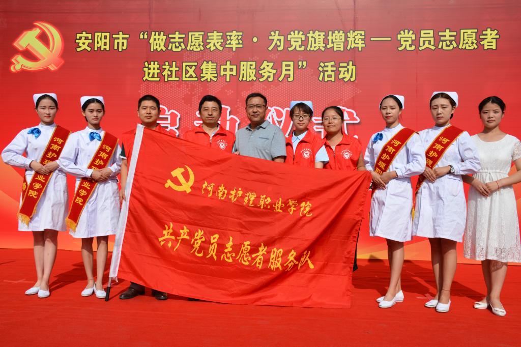 6月26日,安阳市“做志愿表率,为党旗增辉”党员进社区集中服务月活动启动仪式在高新区御景苑社区举行。学院十余名师生党员参加了启动仪式,开展了医疗健康志愿服务活动。护理系冯晓敏老师在启动仪式上代表党员志愿者发言,向全市党员发出倡议,号召全市党员主动融入社区,投身志愿服务,共建和谐家园。