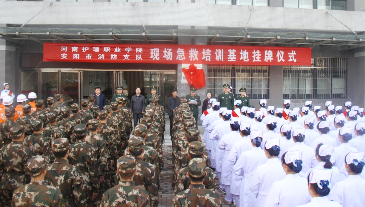 为进一步提高安阳市消防救援队伍专业化水平,提升消防官兵应急处置能力,合力推动“平安安阳”建设。11月23日下午,“安阳消防急救技能培训基地”正式落户开云kaiyun官网,院长郭茂华和安阳市消防支队政委耿军共同为基地揭牌。安阳市消防支队吕军支队长、赵辉副支队长、余晓雷参谋长、夏长天处长及学院钟会亮副院长、张淑爱副院长出席基地揭牌仪式,安阳市消防官兵、学院师生共300余人参加仪式。揭牌仪式由学院王家桥副院长主持。