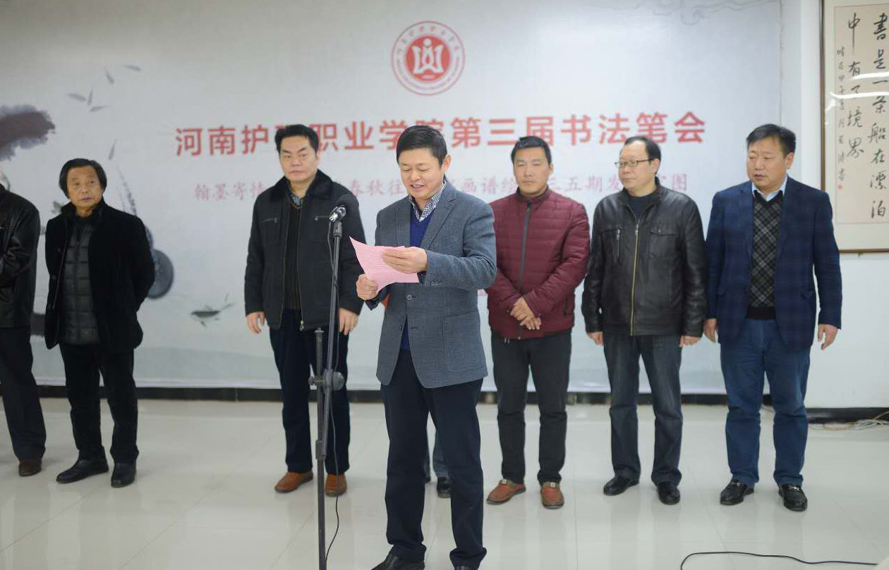 11月26日上午,我院第三届书法笔会在图书馆阅览室举行。学院特邀中国书法家协会理事、河南省书法家协会副主席兼秘书长、河南省书协草书委员会主任谢安钧等八位书画名家出席书法笔会。学院领导花明、胡景团、钟会亮、王家桥及部分中层干部、师生书法爱好者参加了活动。书法笔会由院党委副书记、纪委书记胡景团主持。