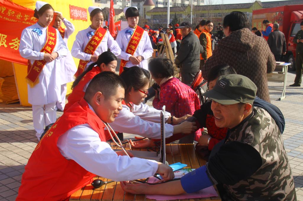 春日明媚的阳光温暖了银杏广场,369志愿服务队志愿者温馨周到的服务点燃了周边群众参与的热情,学院的医疗保健志愿服务活动成了整个活动现场最靓丽的一道风景线。在学院的服务现场,前来咨询健康知识、测量血压、领取健康知识宣传页的群众络绎不绝。在长达三个多小时的志愿服务活动中,先后为群众提供健康咨询服务100余人次、量血压达300余人次,发放健康知识宣传页500余份。参加医疗健康服务的王雪飞、张成才、史利锋等老师用自己的行动诠释了雷锋精神和志愿者服务的内涵,现场的学生志愿者表示,老师不但辛勤工作给予我们知识,在奉献社会方面也给我们做出了表率,是同学们学习的榜样。