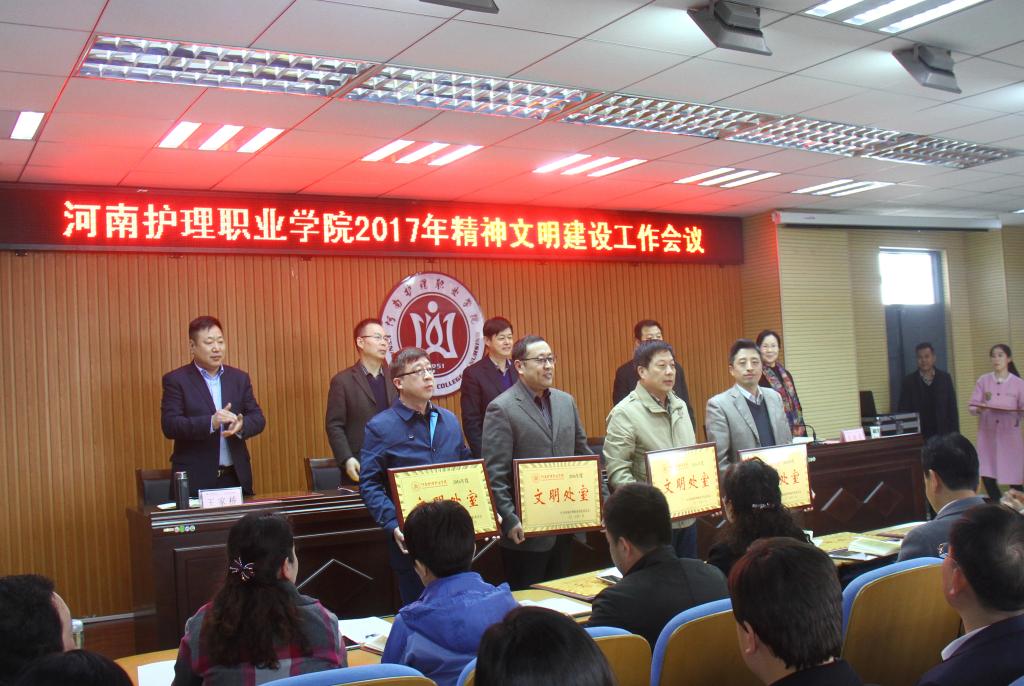胡景团副书记宣读表彰决定,对2016年度文明单位创建工作的先进集体、先进个人、文明处室、文明职工进行表彰和颁奖。副院长钟会亮宣读了《2017年精神文明建设工作要点》。
