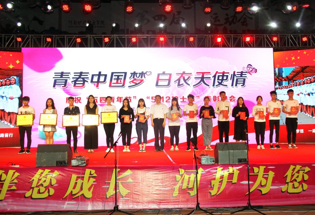 晚会上,隆重表彰了:在2017年河南省高等卫生职业教育护理技能竞赛中荣获团体一等奖、优秀组织奖等多项荣誉的学生和带教老师、学校及安阳市五四青年团员及先进团支部代表以及护理系5·12系列活动“最美代言人”、“青春梦天使情”朗读比赛、“我心中的南丁格尔”职业精神征文比赛、“五星级宿舍”、第二届“最美护生”礼仪风采大赛等获奖代表,参会领导为其颁发奖状,并合影留念。