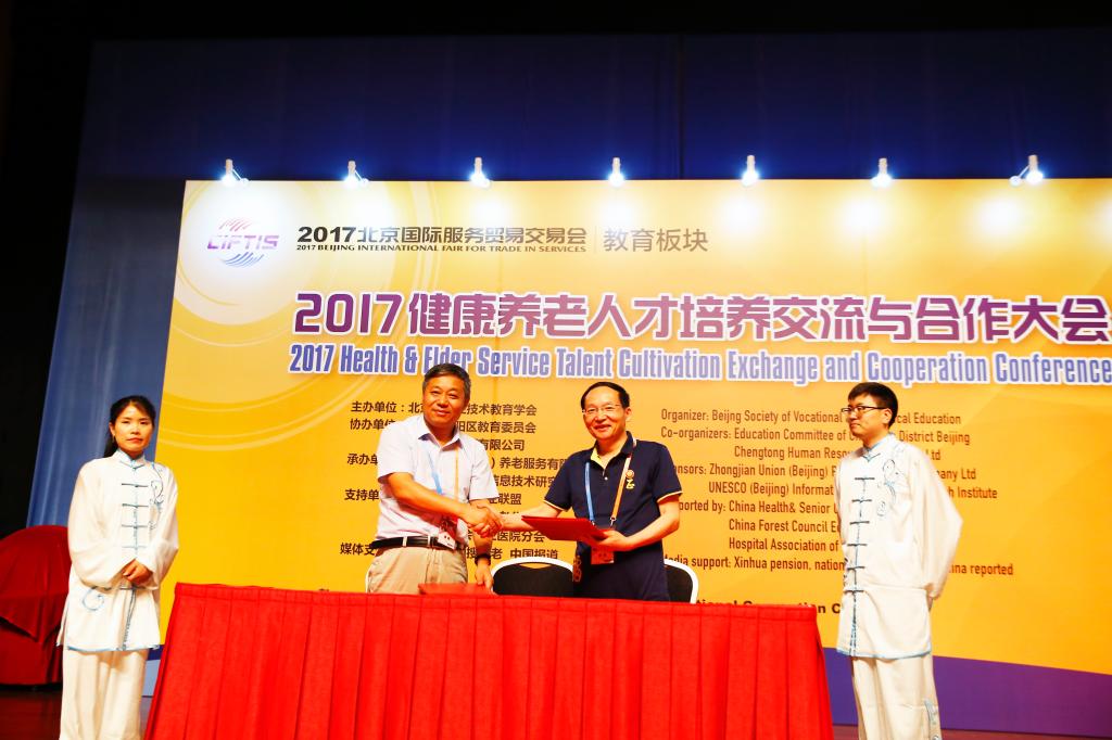 会上,郭茂华院长代表学院与北京中奥伍福集团签署了养老人才订单培养校企合作协议,并与其他嘉宾共同启动了北京市朝阳区养老人才培养联盟成立仪式。这是我院深入推行校企合作,促进产学研相结合的又一重要举措,通过这次大会的良好平台,向社会各界展示了我院良好的发展态势和开放共享的发展理念,有利于促进学院与国内外优质企业开展更深入的养老护理人才培养交流与合作,实现互通共赢。