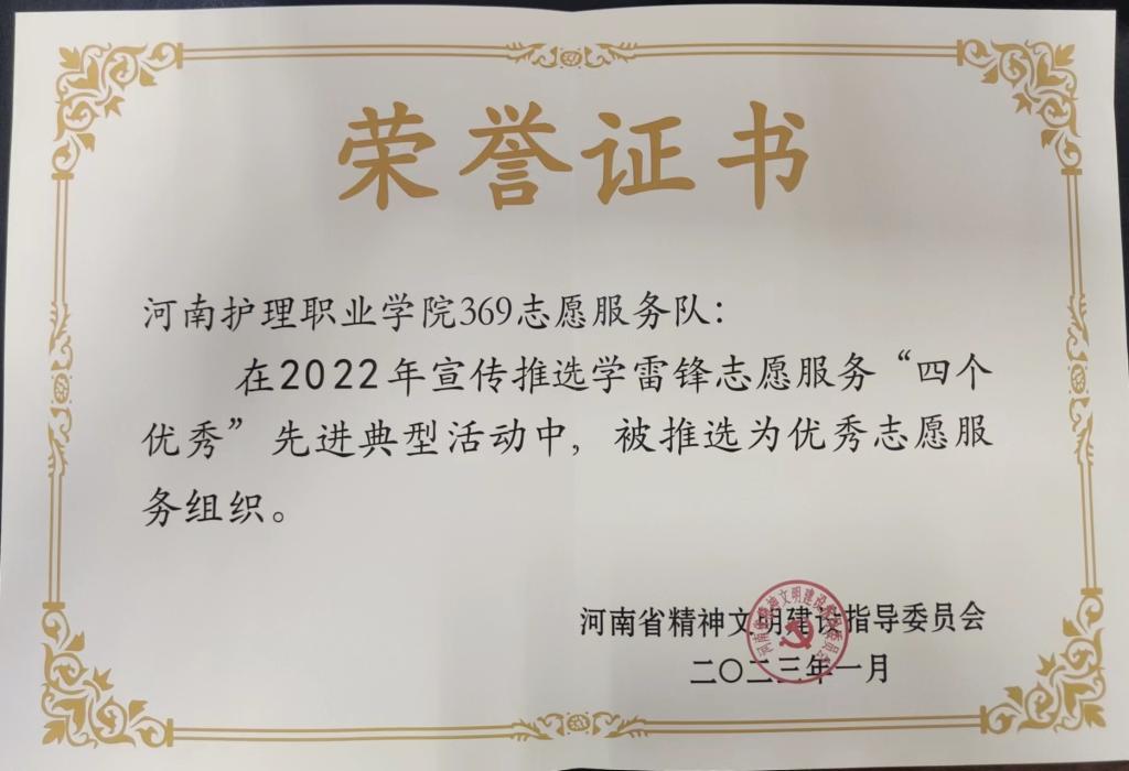 在河南省2022年宣传推选学雷锋志愿服务“四个优秀”先进典型活动中,开云党委推荐的护理系党总支369志愿服务队被评为优秀志愿服务组织。这是开云继荣获“河南省疫情防控志愿服务先进典型”“河南省大中专院校无偿献血工作先进集体”之后,在志愿服务领域再次获得的省级荣誉。