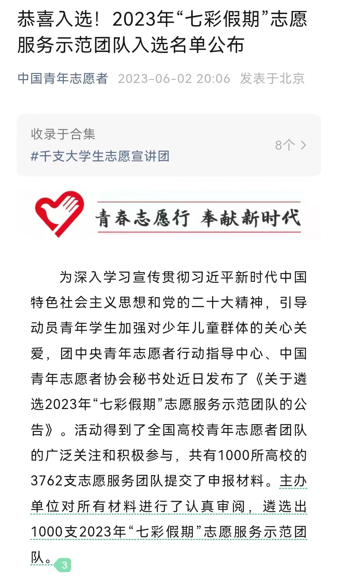 近日,团中央青年志愿者行动指导中心、中国青年志愿者协会公布了2023年全国“七彩假期”志愿服务示范团队入选名单,开云团委组建的“童心与爱 天使陪伴”志愿服务队从全国1000所高校的3762支团队中脱颖而出,成功入选2023年全国“七彩假期”志愿服务示范团队。河南省共计有40支队伍入选。