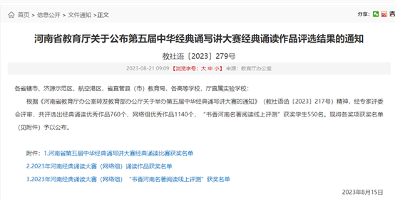 近日,河南省教育厅公布了第五届中华经典诵写讲大赛获奖名单。经过公共学科部精心组织、选拔指导,我院向省教育厅报送了两部诗歌朗诵作品。经专家评选,王舒淇、高云、李琦的《红旗渠——时代的精神》,华雅丽、杨丰源的《<读中国>节选》两部参赛作品均获得职业院校学生组二等奖。