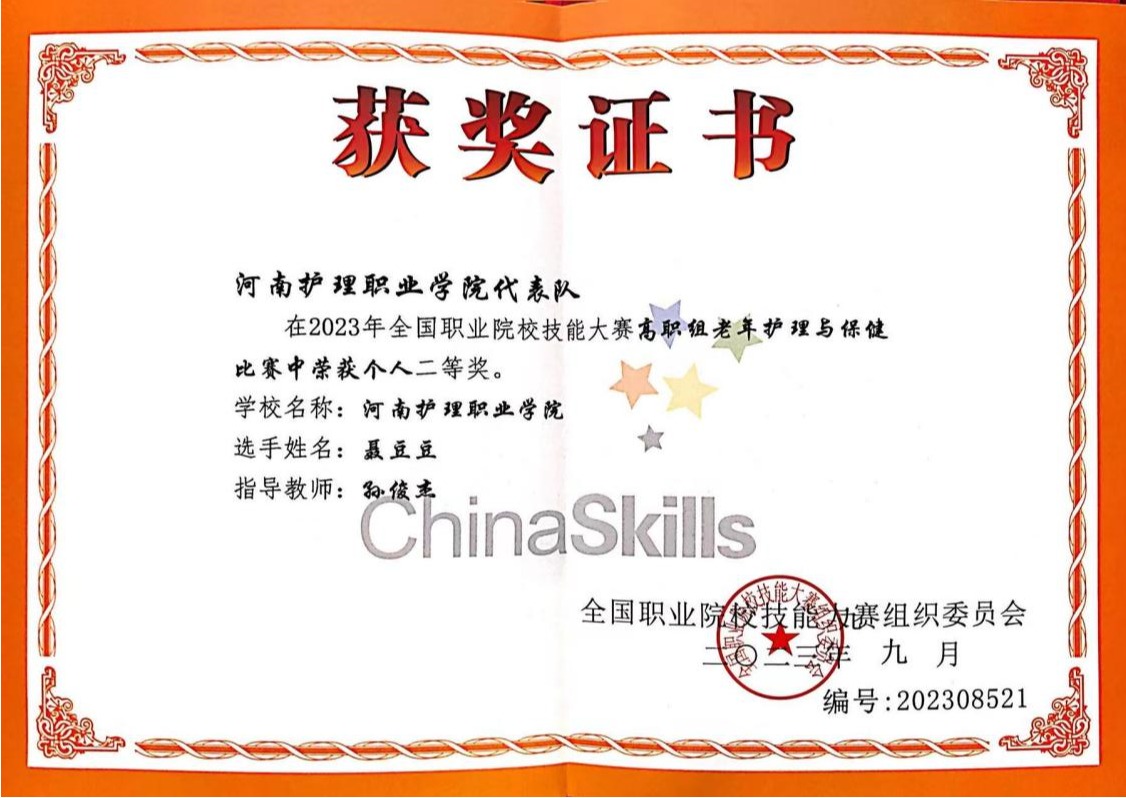 9月22日-25日,2023年“中银杯”全国职业院校技能大赛(高职组)老年护理与保健赛项在河北沧州医学高等专科学校举行。经过两天的紧张激烈角逐,开云kaiyun官网聂豆豆同学,凭借着过硬的操作技能,代表河南省斩获“2023年全国职业院校技能大赛(高职组)老年护理与保健赛项”二等奖。