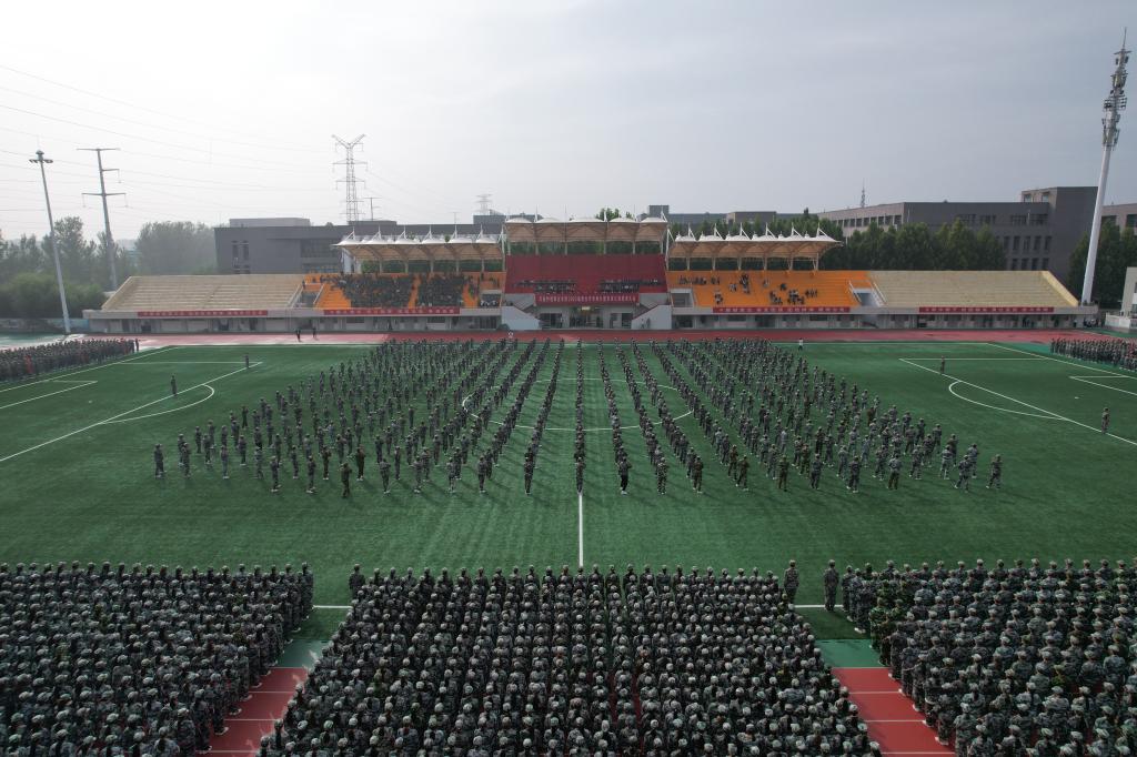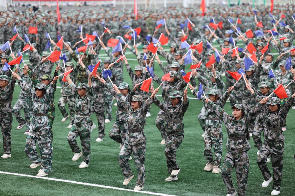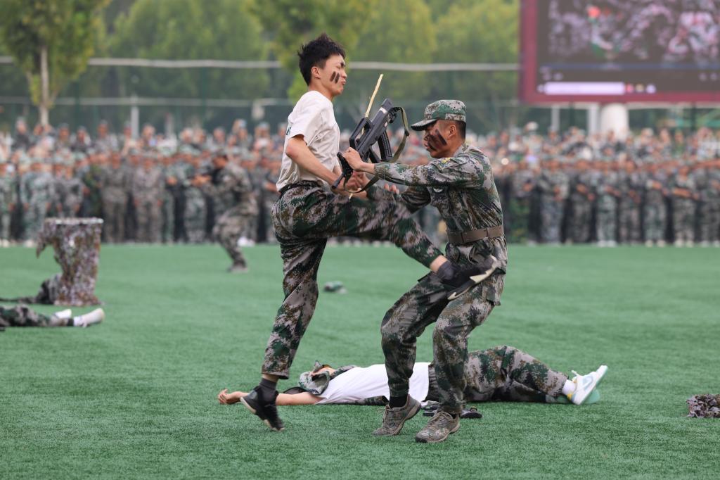 大会在庄严的升旗仪式中拉开帷幕。5000名新生步伐铿锵有力地依次走过主席台接受检阅,分列式、拳术、匕首操、刺杀操、旗语、防护、战场救护、战术演练等军训科目在雷鸣般的掌声中完美展示。整齐划一的方队、威武有力的招式、精练实用的技法、气势如虹的口号,充分展现了新生入学以来的训练成果和新时代大学生的昂扬风貌,彰显出河护学子的青春与活力。