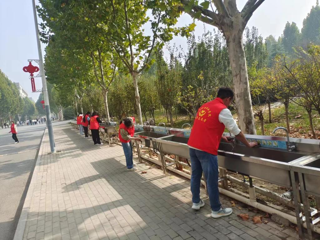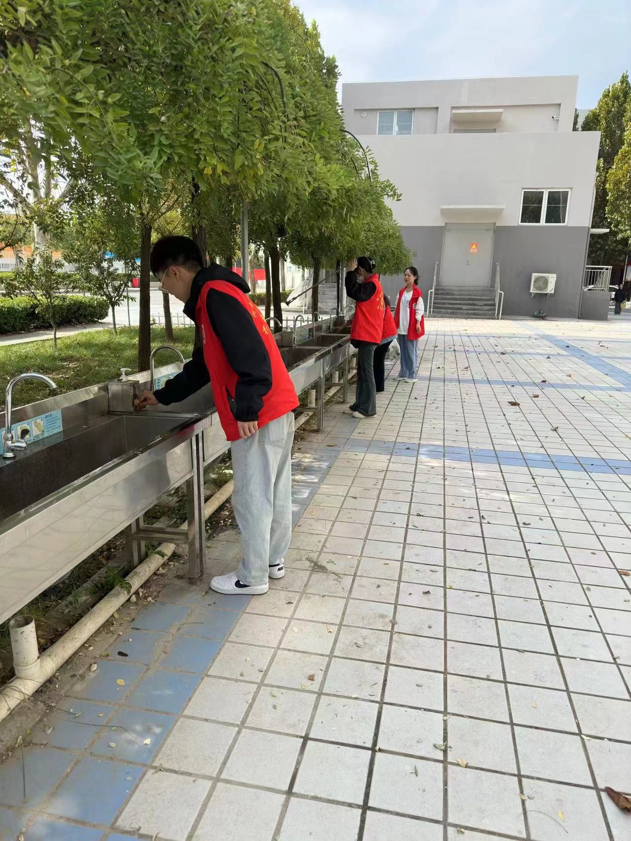 为共创美好校园,志愿者们在校园内清理落叶,仔细擦拭校园宣传板、公共体育器材、体育场看台、洗手池等公共设施,并协助校园爱心献血活动有序开展。