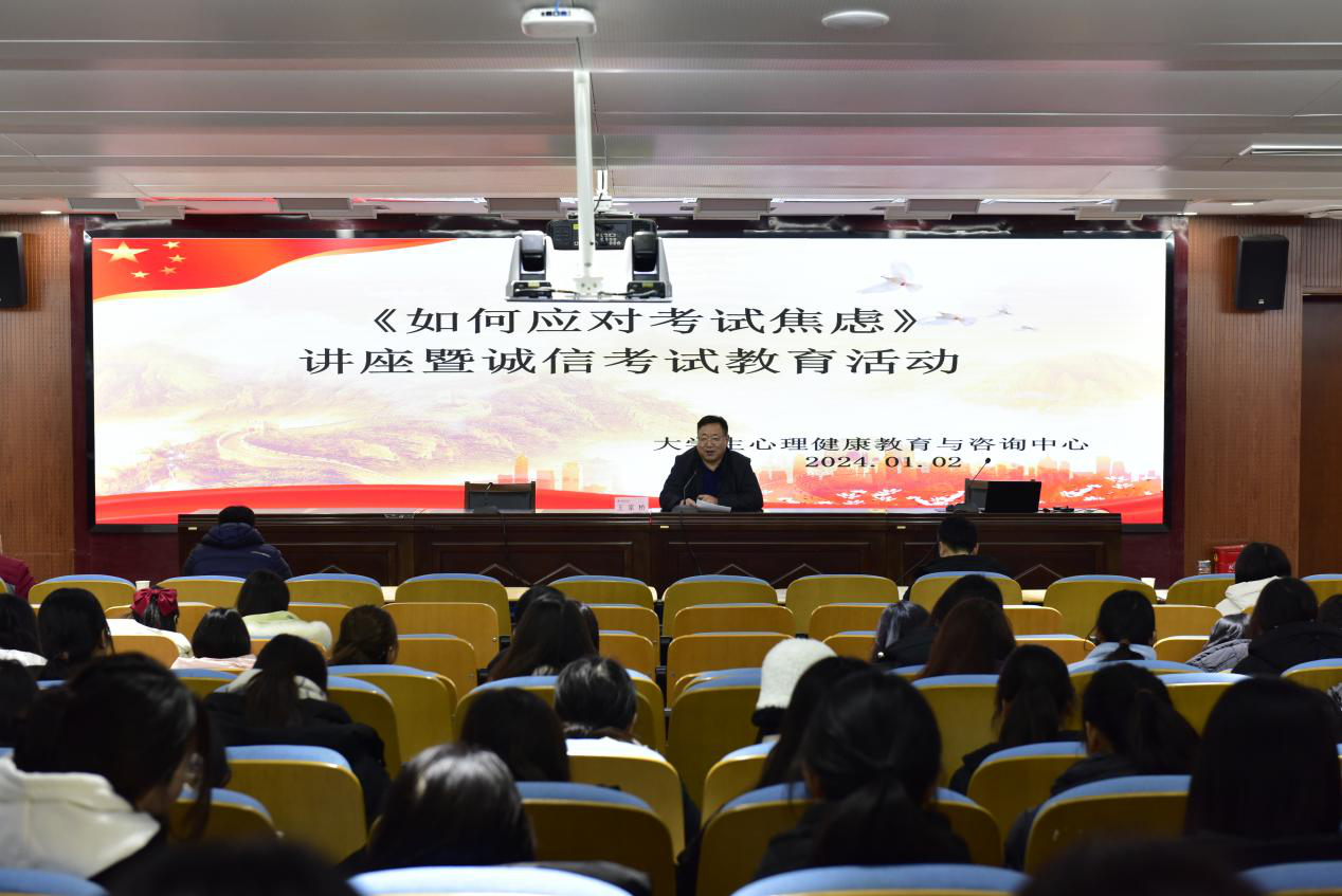 为进一步营造文明、诚信的考试氛围,缓解学生考试焦虑,2024年1月2日,大学生心理健康教育与咨询中心联合党委学生工作部在学术报告厅一楼开展《如何应对考试焦虑》讲座暨诚信考试教育活动,学校副院长王家桥、党委学生工作部负责人、各系党总支副书记、专兼职辅导员、大学生心理健康教育与咨询中心老师和学生代表参加此次活动。