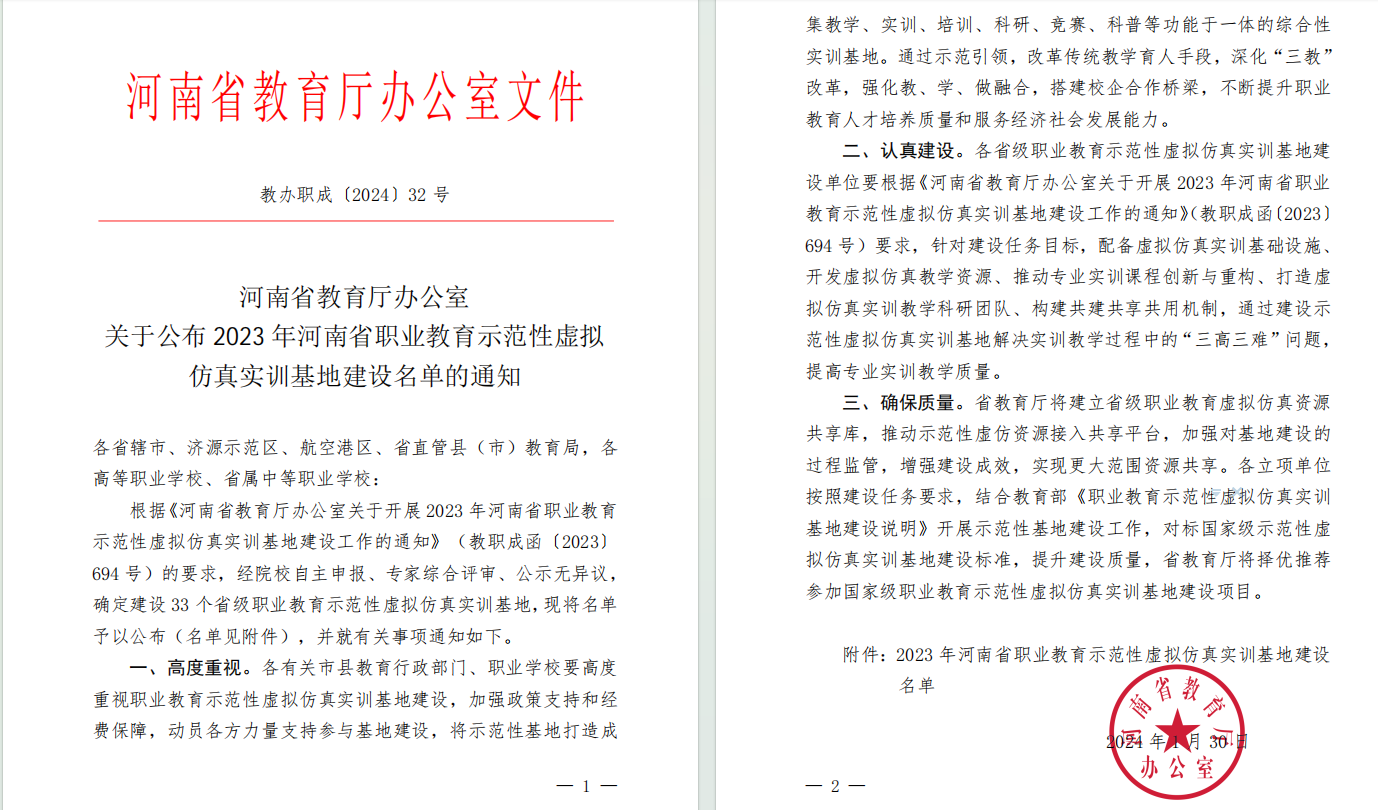 近日,省教育厅办公室公布了2023年河南省职业教育示范性虚拟仿真实训基地建设名单,开云主持建设的“口腔医学专业群虚拟仿真实训基地”被确定为省级职业教育示范性虚拟仿真实训基地。