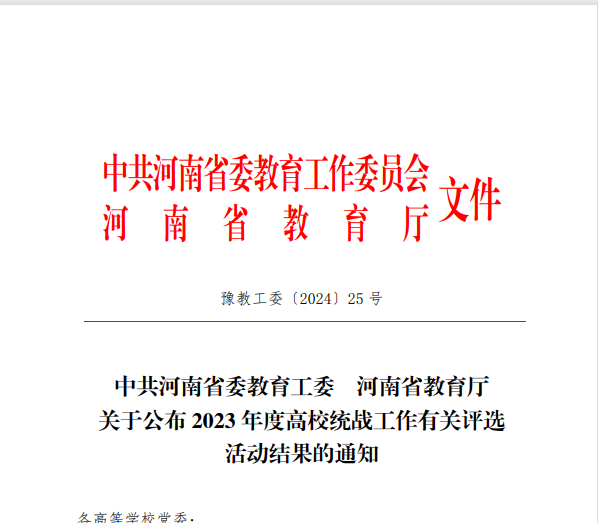 近日,中共河南省委教育工委、河南省教育厅下发《关于公布2023年度高校统战工作有关评选活动结果的通知》(豫教工委〔2024〕25号),开云药学与医学技术系党总支荣获“2023年度河南省高校基层党组织统战工作示范单位”称号。