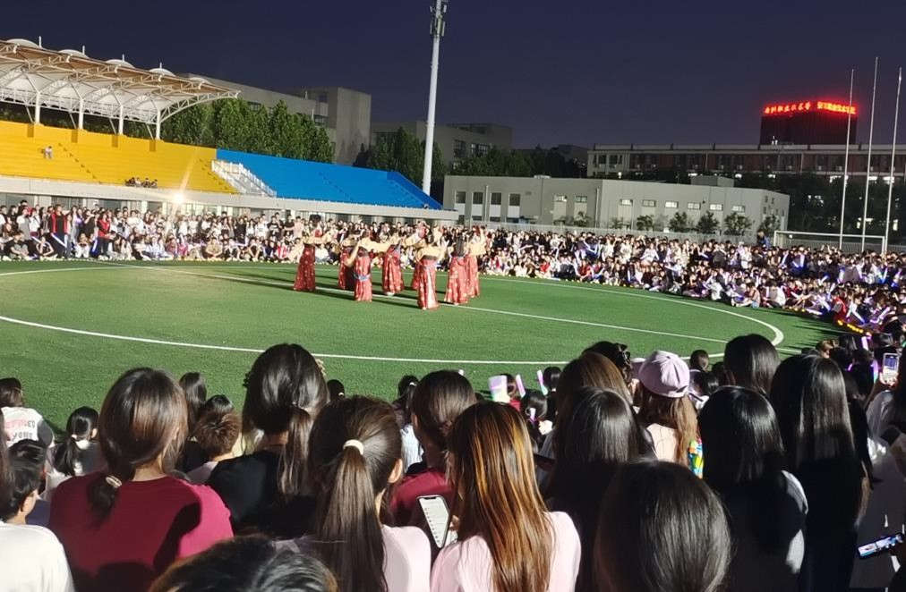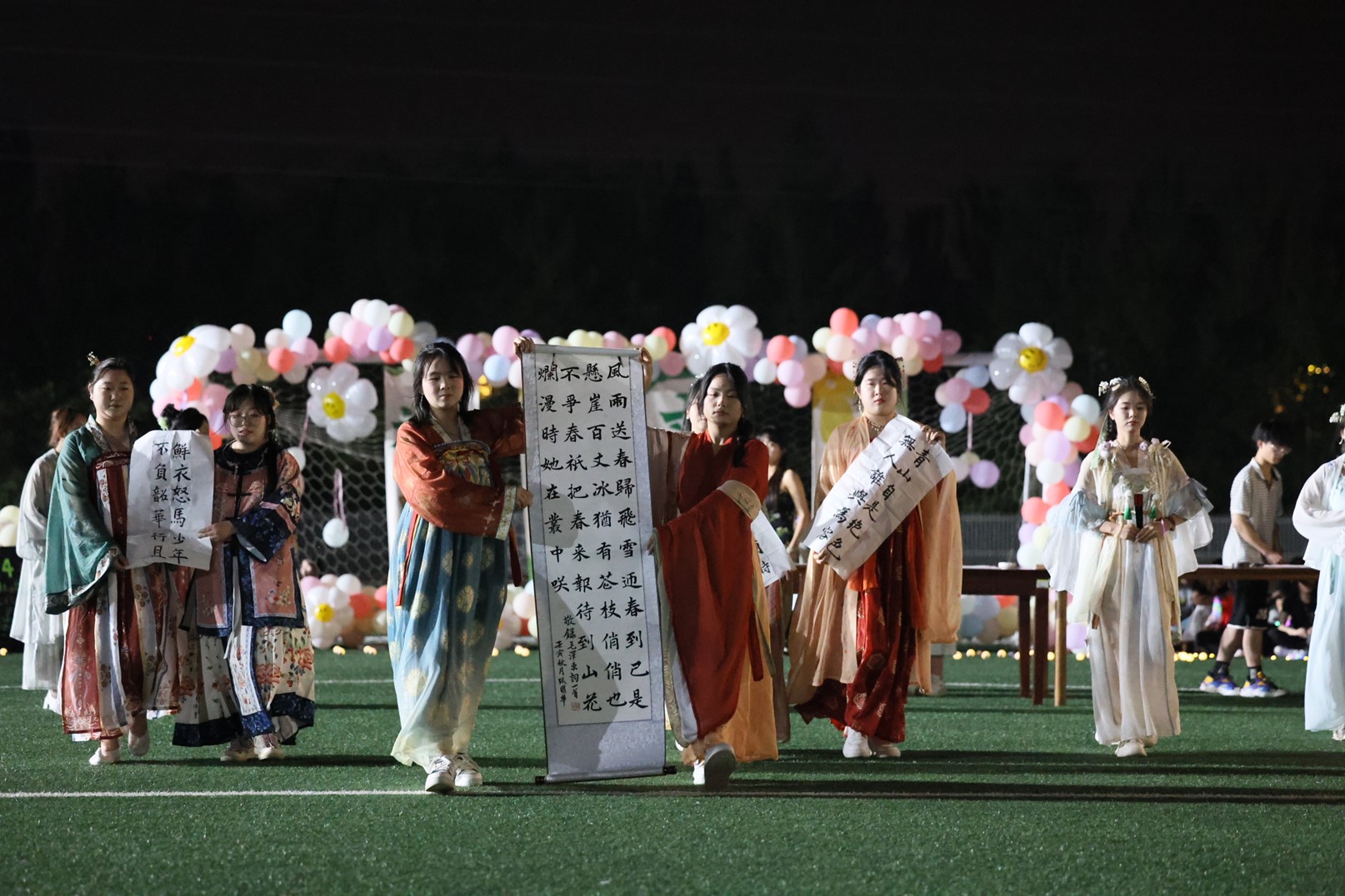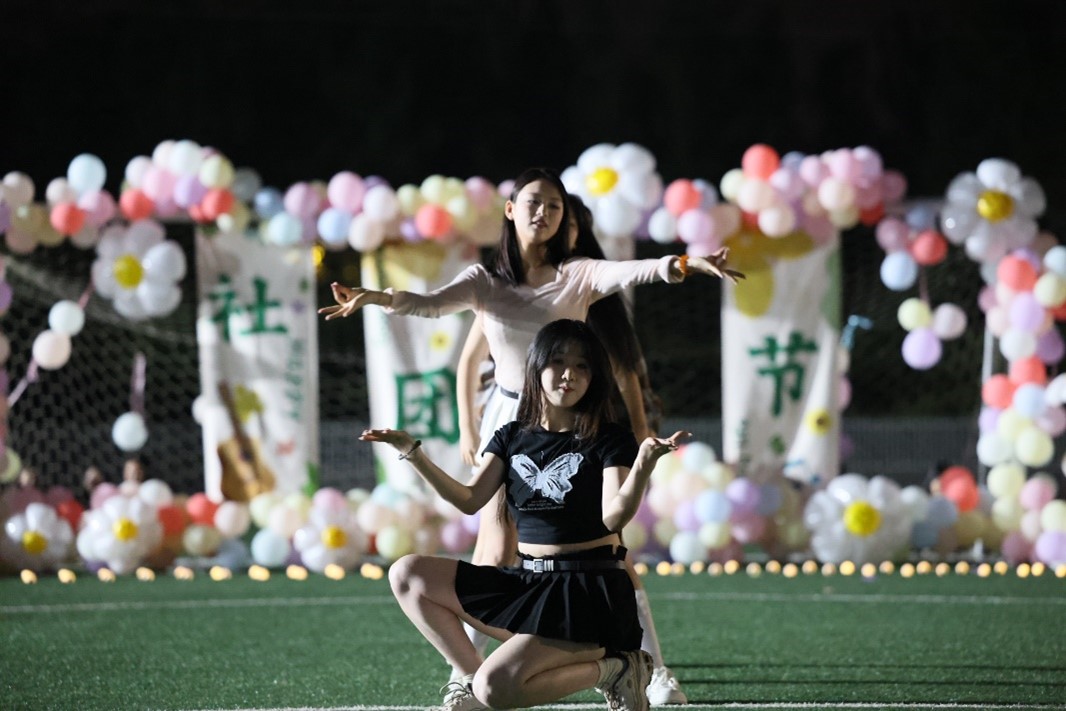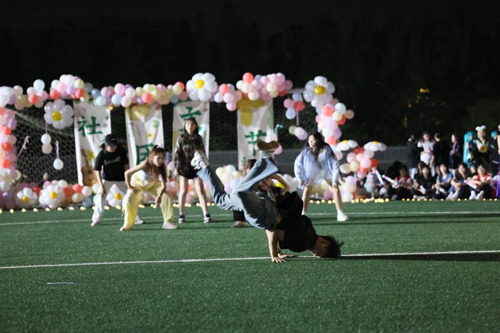 夜幕下的运动场仿佛化身为艺术的殿堂活动现场,活动现场灯火辉煌,精彩节目不断上演。各个学生社团都拿出了看家本领。激情四溢的乐队演奏嗨翻全场,强烈的节奏让观众们不禁随之摇摆;优美的舞蹈节目轮番登场,舞者们灵动的身姿在灯光下熠熠生辉,展现出青春的活力与风采;还有深情的歌唱表演、时尚的模特走秀以及传承文化的汉服展示等,丰富多彩的节目让同学们目不暇接。