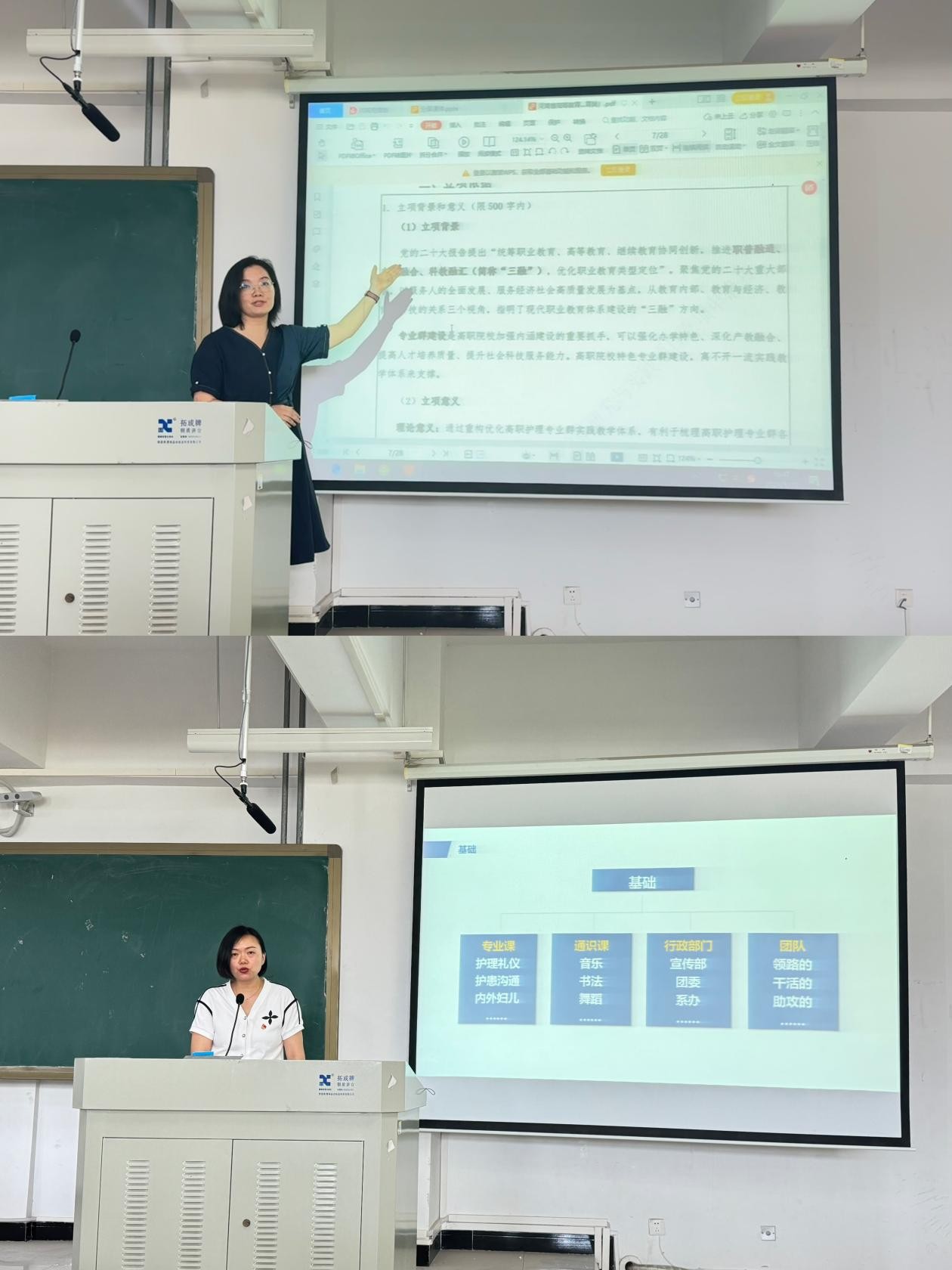本次教学示范观摩课首先由杨艳英、康丽、李娜、史利锋4位省级骨干教师依次进行示范教学,她们精心准备教学内容,凭借其丰富的教学经验、扎实的专业知识以及独具一格的教学风格,为在座的诸位青年教师呈现了一堂精彩纷呈的示范课。本次活动还安排了张荣芳、李晓静两位省级骨干教师,分别从教改项目的选题、切入点、把握国家政策方向、探索落地实践等方面进行分享。