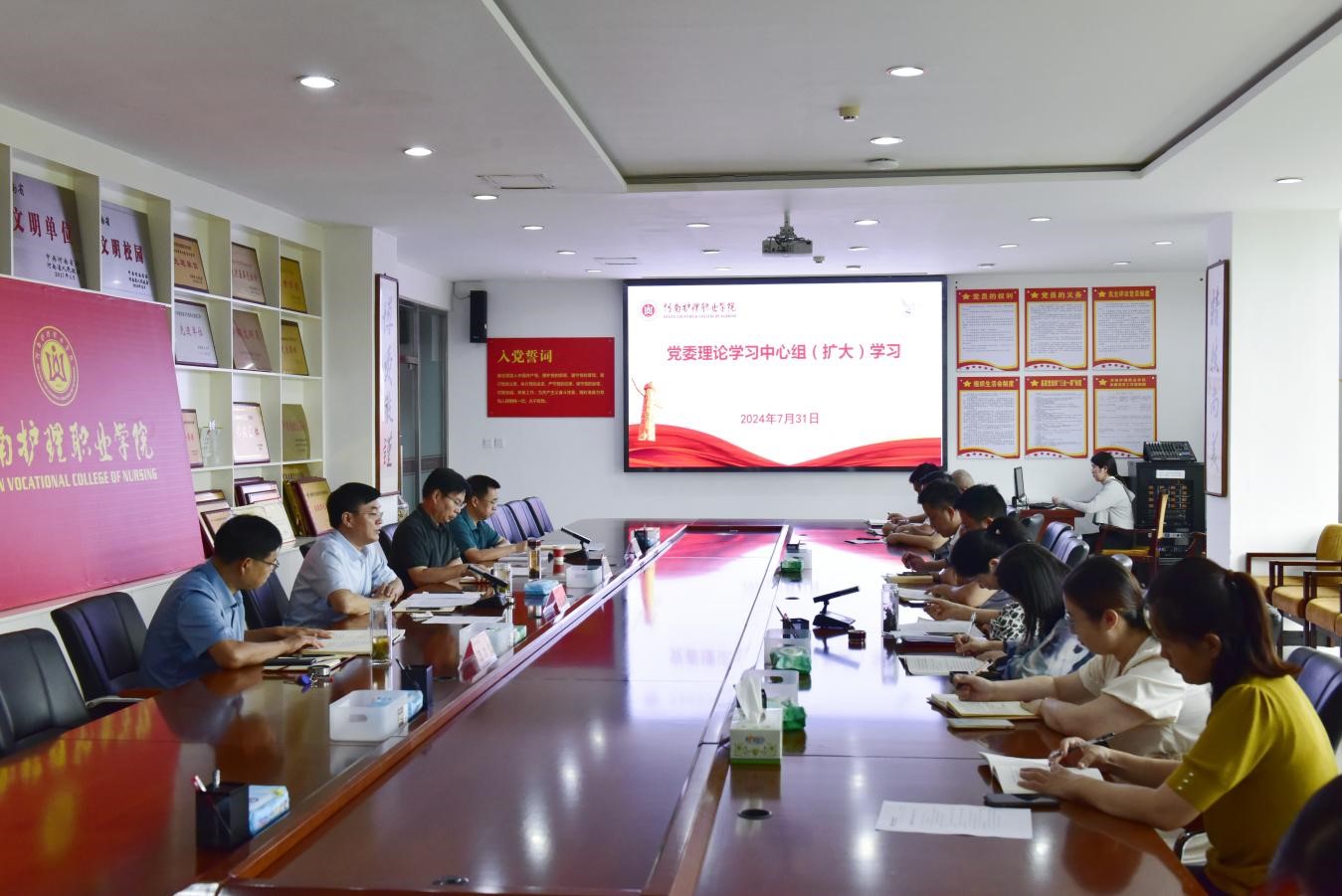 7月31日上午,开云党委理论学习中心组(扩大)学习会议在第一会议室召开,校领导班子成员、各党总支(直属党支部)书记、党委组织部、党委宣传部部门负责人参加会议。会议由党委副书记、院长胡仕坤主持。