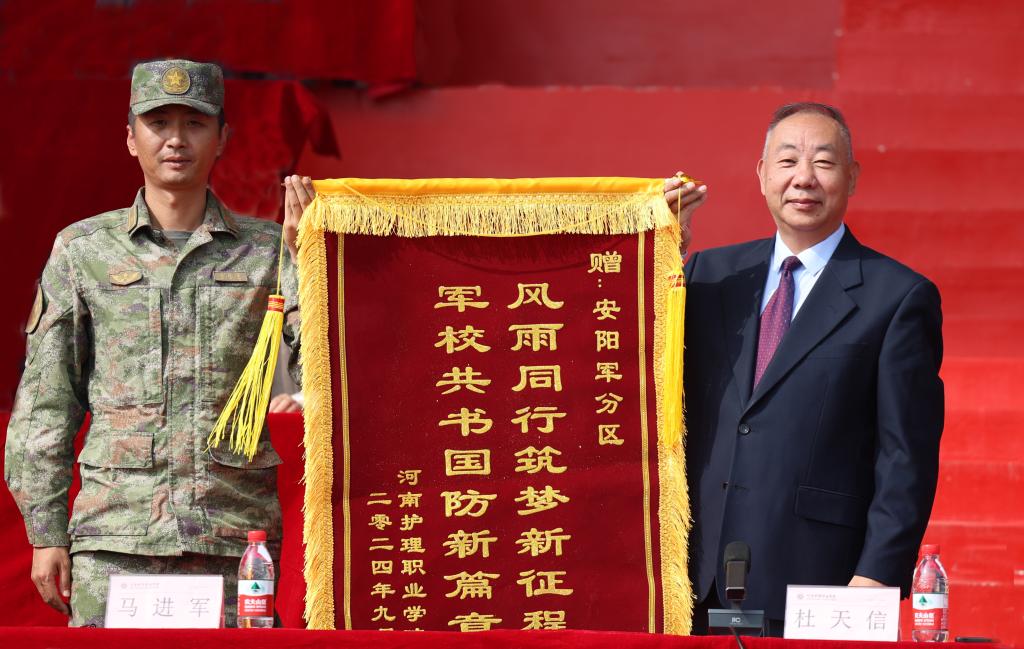 在热烈的掌声中,党委书记杜天信向承训部队赠送锦旗。