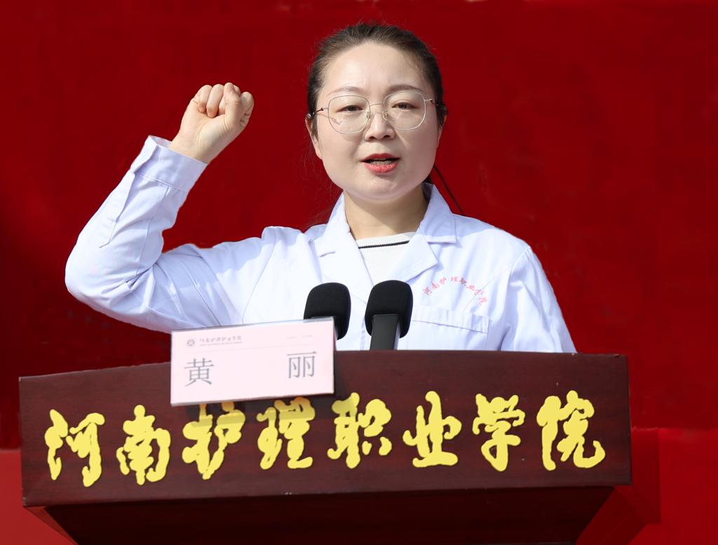 护理系黄丽老师带领全体新生宣读医学生誓词。铮铮誓言,字字千钧,表达了同学们为医学事业奋斗终身的坚定决心。