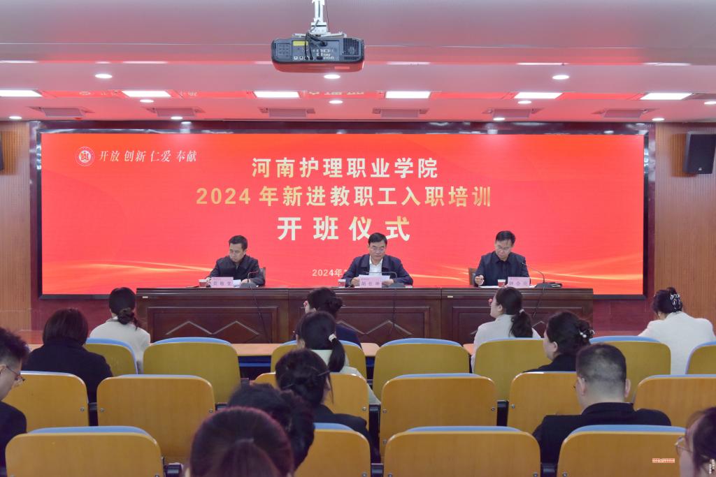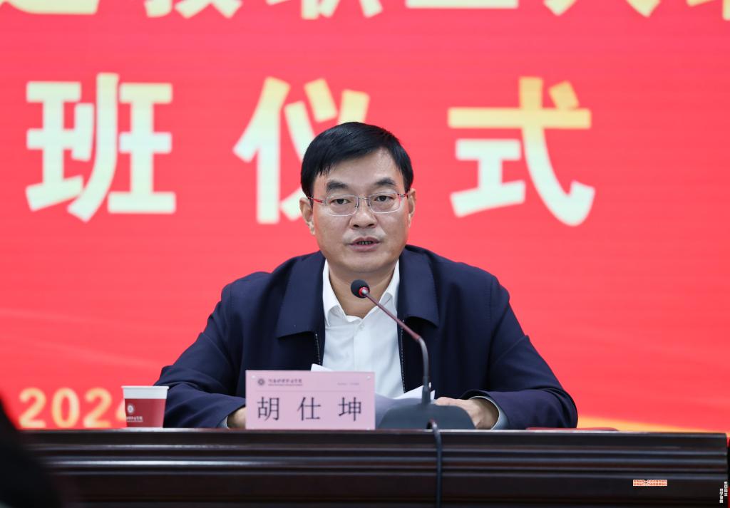 胡仕坤发表讲话,他代表学校向40位新进教师表示热烈的欢迎,指出新进教师是学校师资队伍的新鲜血液和新生力量,为学校注入了新的活力,增添了新的希望。他对新入职教职工提出殷切期望:一要践行立德树人根本任务,做学生拔节孕穗的引路人。希望大家牢固树立心有大我、至诚报国的理想信念;涵养言为士则、行为世范的道德情操;凝聚启智润心、因材施教的育人智慧;展现勤学笃行、求是创新的躬耕态度;保有乐教爱生、甘于奉献的仁爱之心;坚守胸怀天下、以文化人的弘道追求,努力用自己的学识、阅历、经验,帮助学生把好人生的“总开关”。二要潜心教书育人,做传道授业解惑的传承者。希望大家做好个人职业生涯规划,尽快转变角色,明晰发展目标,秉持勤学笃行、求是创新的躬耕态度,成为终身学习的践行者,以成为“名师”为目标,在为学、为事、为人方面齐发力,全方位充实自己、完善自己、提升自己,真正达到“学高为师、身正为范;学为人师、行为世范”的师者标准。三要融入学校,做学校改革发展的推动者。希望大家将个人成长融入学校发展大局,带着时不我待的紧迫感、只争朝夕的使命感、奋斗有我的责任感,在青春的赛道上奋勇争先、不懈进取,创造出不辱使命、不负韶华的好成绩,推动学校各项事业不断迈上新的台阶,为全面推进强国建设、民族复兴伟业贡献自己的力量。