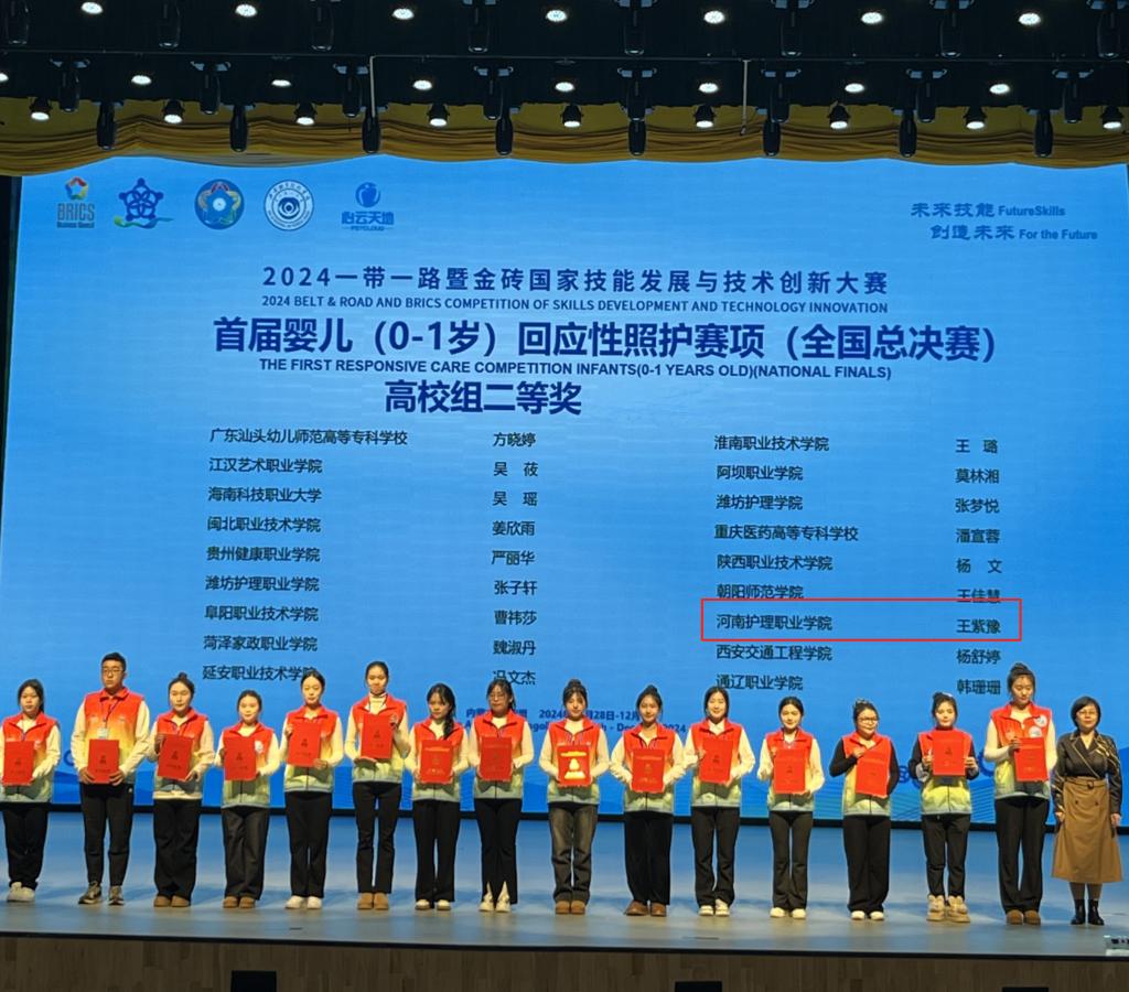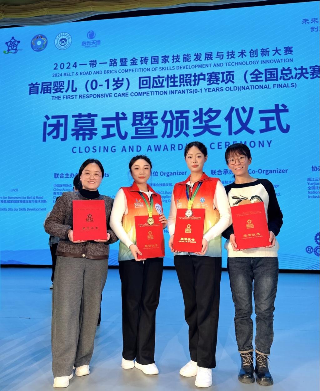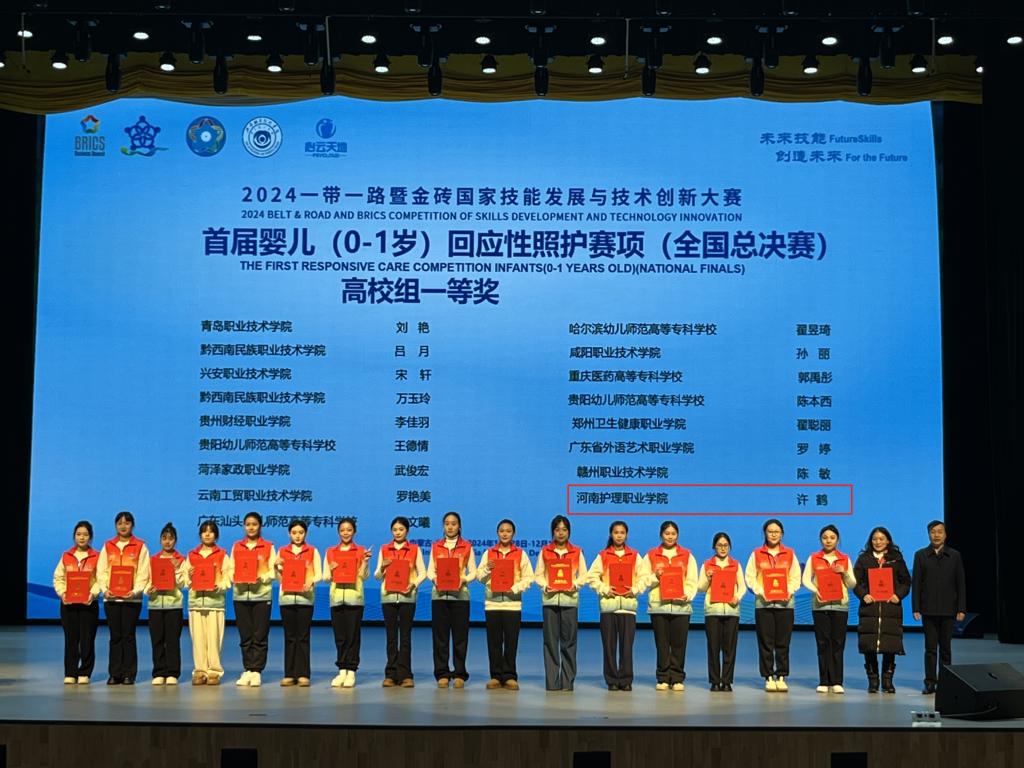 11月29日至12月1日,2024“一带一路”暨金砖国家技能发展与技术创新大赛首届婴儿(0~1岁)回应性照护赛项全国总决赛在内蒙古兴安盟兴安职业技术学院圆满落下帷幕。本次大赛吸引了来自全国26个省、自治区148所院校的众多优秀选手同场竞技,开云护理系学生许鹤、王紫豫在激烈角逐中脱颖而出,喜获一等奖和二等奖,教师魏艳艳、王晓令荣获优秀指导教师,开云荣获最佳组织奖。