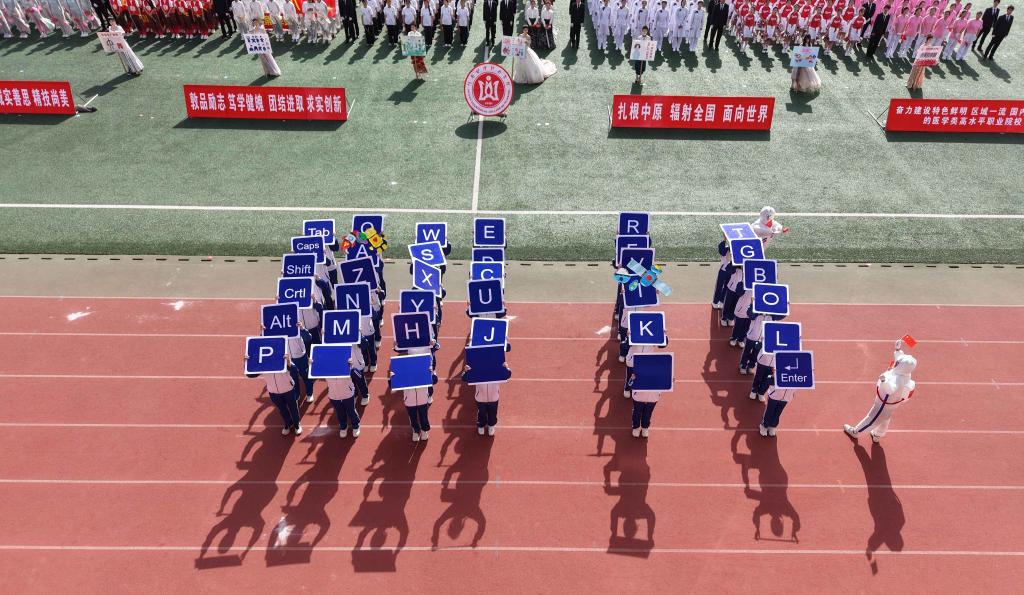 伴随着《运动员进行曲》的激昂旋律,国旗护卫队、校旗队、彩旗队和各代表方队依次精彩登场。他们步伐稳健、列队整齐、口号响亮、气势磅礴,以高涨的热情展示各自方队的特色,展现出河护师生团结奋斗、勇往直前的精神风貌。