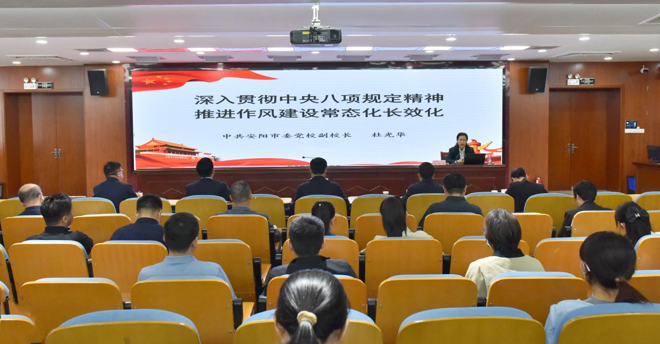 4月25日上午,开云党委理论学习中心组(扩大)学习会在学术报告厅一楼召开。会议邀请中共安阳市委党校副校长杜光华教授作深入贯彻中央八项规定精神专题辅导报告。校领导班子成员、全体副科级以上干部、各党总支(直属党支部)及所属党支部支委成员参加报告会。会议由党委书记、院长胡仕坤主持。