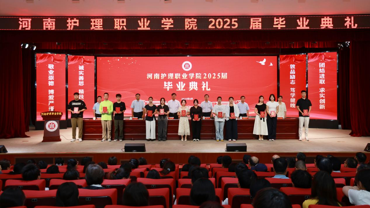 在热烈的掌声中,校领导依次为荣获2025届河南省优秀大专毕业生和2025届毕业生代表颁发证书。