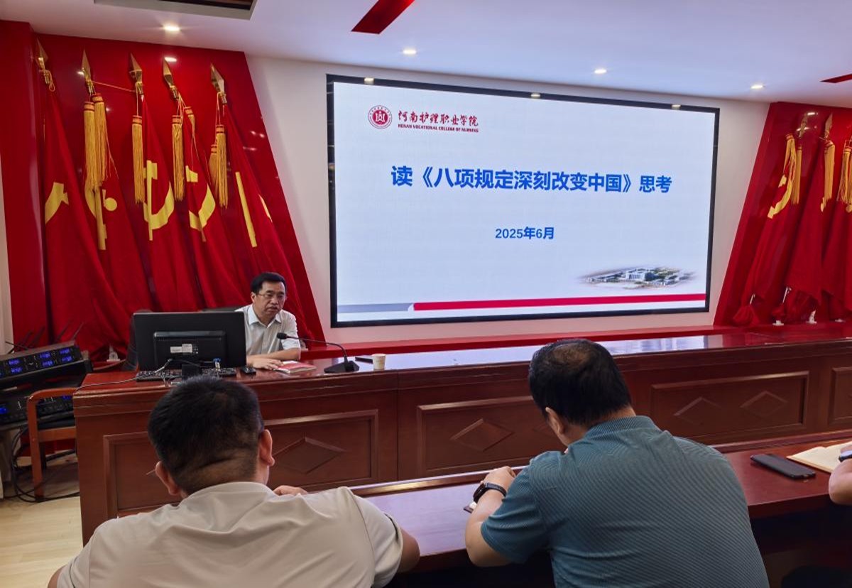 党委委员、副院长常慧敏以《新时代的徙木立信之举——中央八项规定精神》为题,从中央八项规定精神的背景介绍、主要内容、措施特点、工作实效及下步打算五个维度进行了系统阐释。详细梳理了改进调查研究、精简会议活动等具体要求,并结合教育领域的实际案例,展现了作风建设所取得的阶段性成效。她提出全体教职工要提高政治站位、深化思想认识,严以律己、以身作则,强化监督、共筑防线,共同维护学校的良好形象,为营造清朗的教育生态贡献力量。