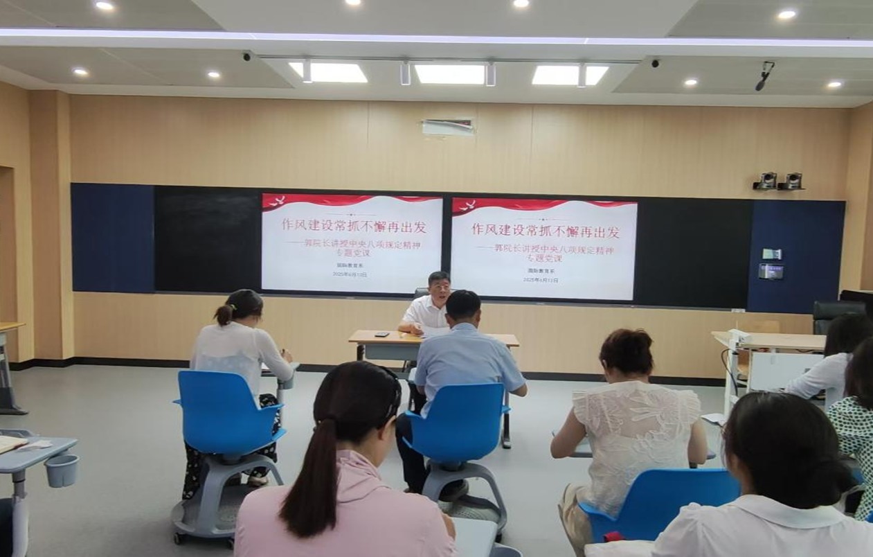 党委委员、副院长郭海旺以《作风建设常抓不懈再出发》为题,为国际教育系全体党员干部讲授专题党课。郭海旺系统阐述了中央八项规定出台的背景、重大意义及具体内容,强调中央八项规定是全面从严治党的重要抓手,全体党员必须将其内化于心、外化于行,在日常工作和生活中严守纪律底线,坚决抵制形式主义、官僚主义等不良作风。同时,他鼓励全体党员干部从自身做起,充分发挥党员的先锋模范作用,以优良的工作作风推动学校向更高水平的医学类职业院校发展。