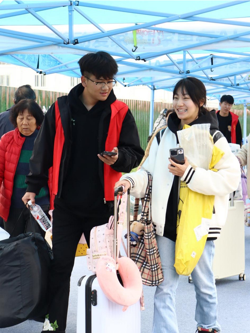 踏出站台,即是归处。学校迎新服务在各大交通枢纽温暖启幕,志愿者们分赴火车站、汽车站与高铁站,热情的笑脸和周到的服务让新生们感受到第一缕归属感。温暖延伸至校园里,百余名志愿者不仅是“活地图”,更是“知心学长学姐”。他们主动伸出援手,一次次接过沉重的行李,也驱散了新生们初入校园的迷茫与忐忑。