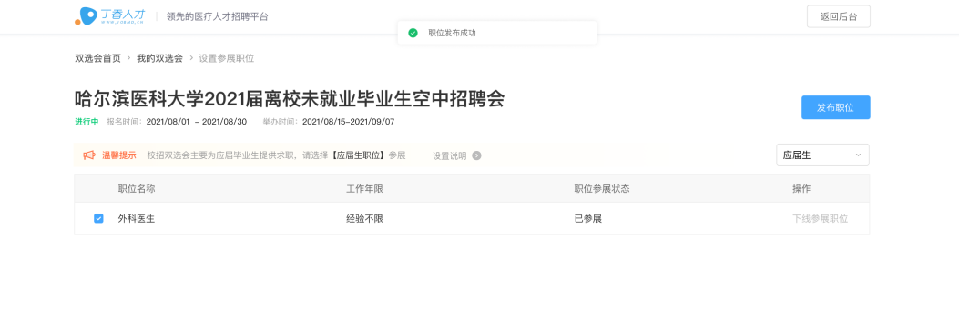 5.发布职位后即为报名完成,您可继续发布剩余参展校招职位,待工作人员审核通过后即可全部展示在招聘会页面
