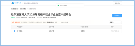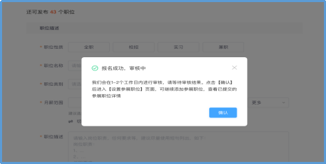 5.发布职位后即为报名完成,您可继续发布剩余参展校招职位,待工作人员审核通过后即可全部展示在招聘会页面