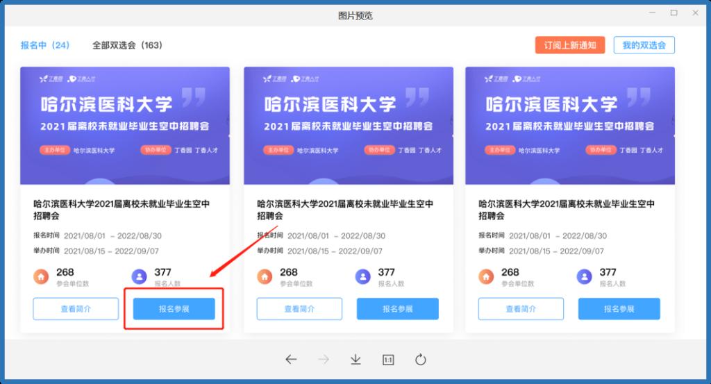3.点击企业管理后台左侧“高校双选会”,选择需要报名的高校招聘会场次进行报名(新注册用户自动进入招聘会报名页面)