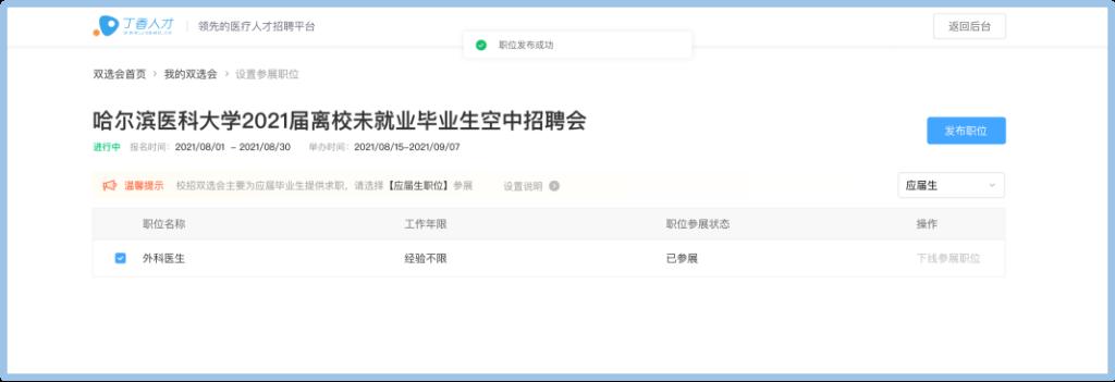 5.发布职位后即为报名完成,您可继续发布剩余参展校招职位,待工作人员审核通过后即可全部展示在招聘会页面