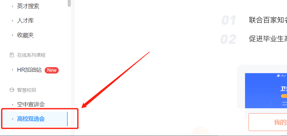 3.点击企业管理后台左侧“高校双选会”,选择需要报名的高校招聘会场次进行报名(新注册用户自动进入招聘会报名页面)