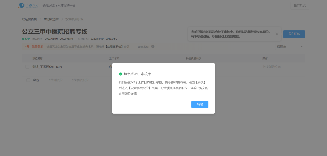 5.发布职位后即为报名完成,您可继续发布剩余参展校招职位,待工作人员审核通过后即可全部展示在招聘会页面