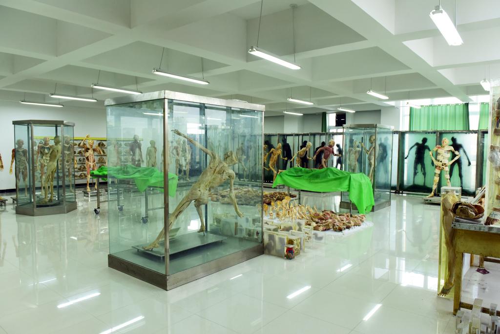 标本陈列室占地面积约220平米,现陈列有整体甘油标本10具、整体连续断层标本3套(冠状切、矢状切及水平切各1套)、连续层次解剖塑化标本1套(共8具)、全身血管铸形标本2具、全身神经概观标本2具、整体塑化标本10具及各种局解标本500余件。