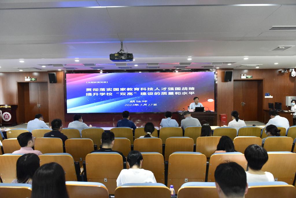 党委副书记、院长胡仕坤以《贯彻落实国家教育科技人才强国战略 提升学校“双高”建设的质量和水平》为题,围绕党的二十大精神,以多角度、深层次的视角从5个方面与大家进行了分享交流。胡仕坤强调,全校上下要深入学习贯彻落实党的二十大精神,全面贯彻党的教育方针,落实立德树人根本任务,牢牢把握新时代人才培养需求,以高质量发展为主题,以提高学生创新能力为主线,强化新时代教师队伍建设,推进产学研深度融合,奋力提升学校“双高”建设的质量和水平。在贯彻落实国家教育科技人才强国战略的进程中,充分发挥高校在加快建设教育强国、科技强国、人才强国中的生力军作用,培养担当民族复兴大任的时代新人。