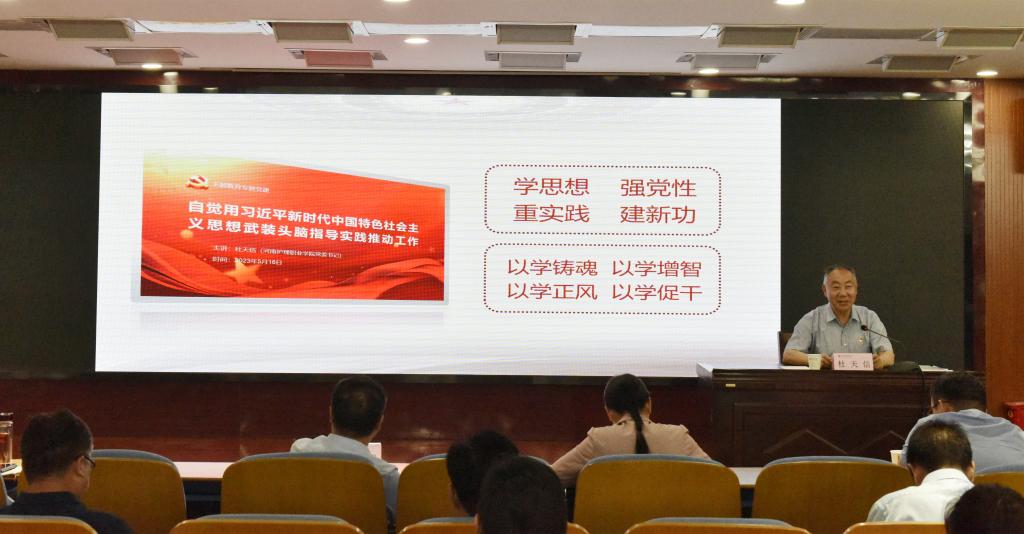 党委书记杜天信以《自觉用习近平新时代中国特色社会主义思想武装头脑、指导实践、推动工作》为题,围绕习近平总书记的重要讲话精神和省委教育工委部署要求,为在座领导和党员干部讲授了一堂精彩纷呈的专题党课。省委教育工委主题教育第四巡回指导组副组长曹相智,成员戴晓琴、王亚锴莅临学校指导,学校党委班子成员、全体副科级以上干部、党总支及党支部支委成员到场聆听。