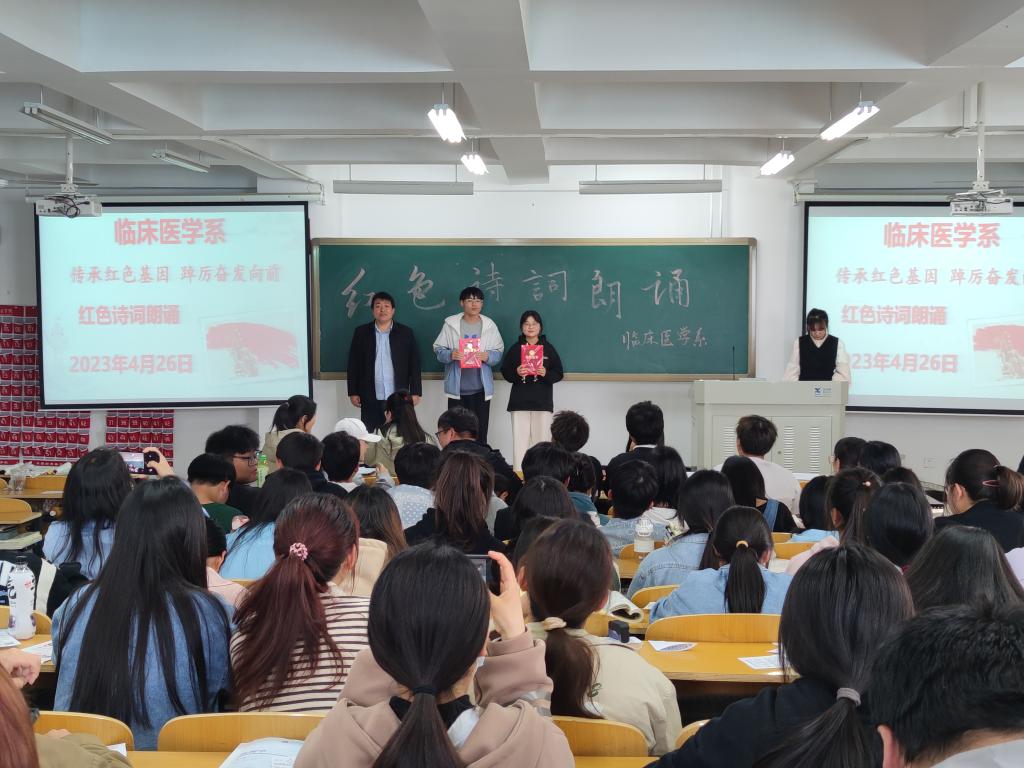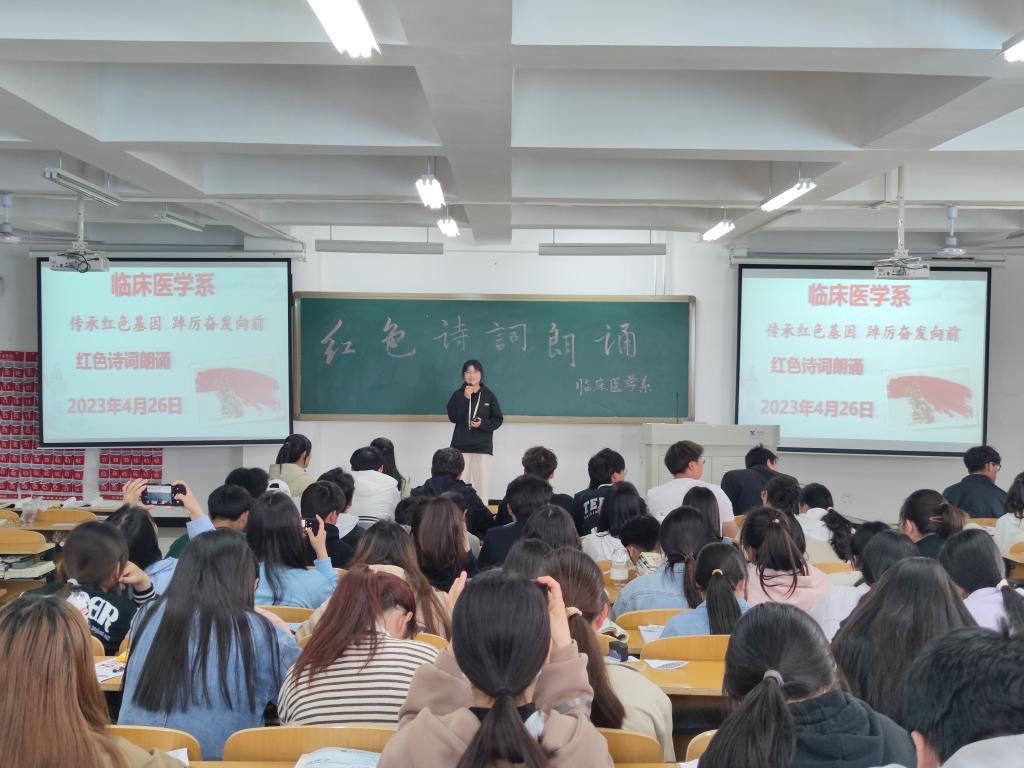 “怒发冲冠,凭栏处、潇潇雨歇。抬望眼、仰天长啸,壮怀激烈。”4月26日下午,开展以"传承红色基因踔厉奋发向前"为主题的红色诗词朗诵大会。临床医学系精心部署、广泛发动,现场同学们激情飞扬、慷慨陈词,用充沛的感情、朗朗上口的诗句,以饱满的热情、昂扬的斗志和满腔的热血,让在座师生领略经典、感悟文化、体会中国精神。活动最后,现场全体师生集体诵读《满江红》,嘹亮的声音久久回荡,激励学子们奋勇向前、砥砺前行。