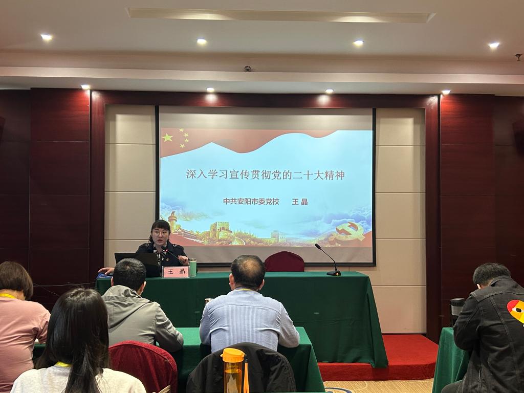 开班仪式结束后,安阳市委党校政法教研室主任、副教授王晶作题为《深入学习宣传贯彻党的二十大精神》的专题辅导讲座。王教授从深刻理解党的二十大的宏大意义、准确领会党的二十大的“五个牢牢把握”和贯彻落实党的二十大的决策部署三个方面展开详细的论述。讲座内容丰富、深入浅出,风趣幽默,现场教师互动时纷纷表示要提高政治站位、强化理论学习,将党的二十大精神学懂、弄通、悟透,积极推动党的二十大精神进教材、进课堂、进头脑。