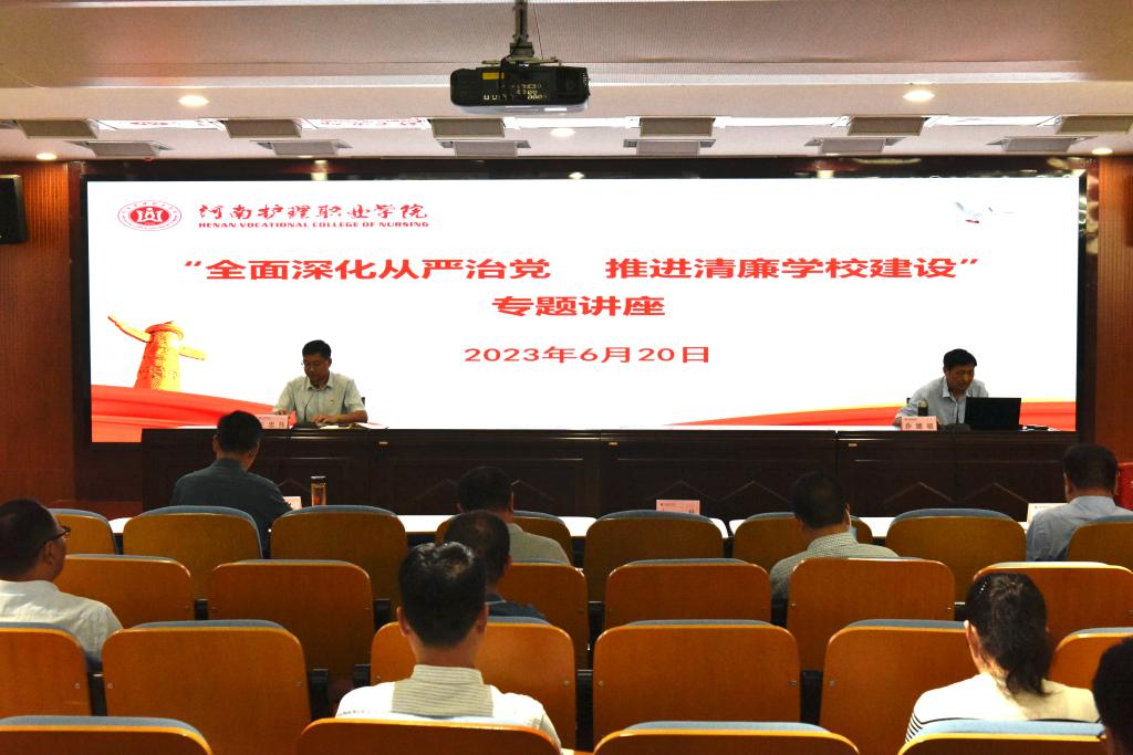 为深入推进党风廉政建设与清廉学校创建工作,进一步强化党员干部的纪律规矩意识,6月20日,学校特邀华北水利水电大学清廉中国研究中心主任、河南省教育廉政研究中心秘书长乔德福教授和华北水利水电大学行政管理系主任、河南省教育廉政建设研究中心办公室主任卜凡博士到我院作专题讲座与交流指导。乔德福教授作了题为《全面深化从严治党、推进清廉学校建设》的专题讲座,学校副科级以上干部参加,纪委书记王忠伟主持。